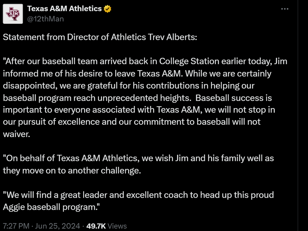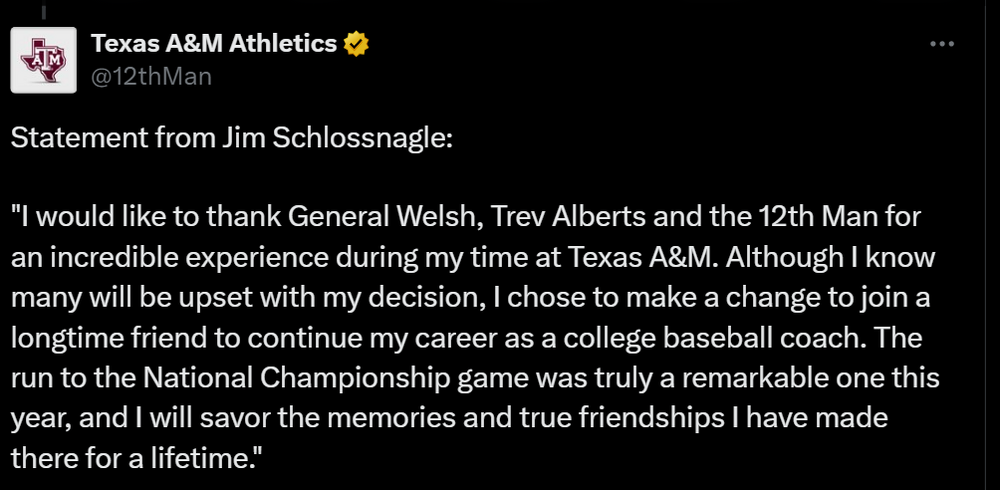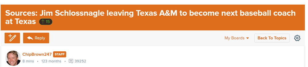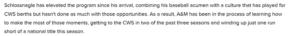 8. Here's the complete FCB article on the Schlossnagle hiring. Given his reported close relationship w/ Del Conte, am assuming this is consistent w/ what Del Conte knows or believes. Couple of nuggets - - he too says - or confirms the rumor - that Schlossnagle is bringing his staff w/ him - says Schlossnagle made his decision TUESDAY AFTERNOON ... a few hours before Game 3 of the CWS Finals. Yikes. Sources: Jim Schlossnagle leaving Texas A&M to become next baseball coach at Texas ChipBrown247 (Horns 247)