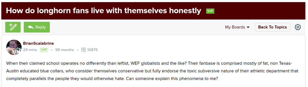 4. Lolololololol ... lololololol .... lol. This "article" is quite something. The staff writer (Carter Karels / Aggie 247) refers to an incident after the press conference being revealing. Yeah, what the article really reveals is his/Aggies' dopeyness and hypocrisy. "In his 23 seasons as a head coach, which has included seven College World Series appearances, Schlossnagle has been known to prioritize success over integrity." And yet you hired him, and praised him to high heaven. "Not to mention, what Schlossnagle did to A&M is exactly what he did to TCU." And yet you hired him, and praised him to high heaven. (And now criticize him for doing that to you.) "But what will all of that mean for a coach whose credibility is on life support? A coach who has a reputation as a pathological liar? A coach who can't handle even the slightest push back?" It means you should submit this article to The Onion, bro ... bwaahahahaha ... Sheesh. Full article below. Column: Jim Schlossnagle showed his true colors Carter Karels (Aggie 247)