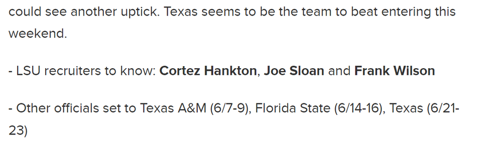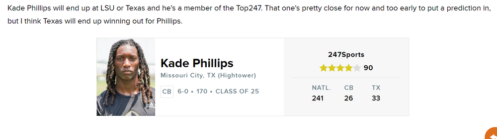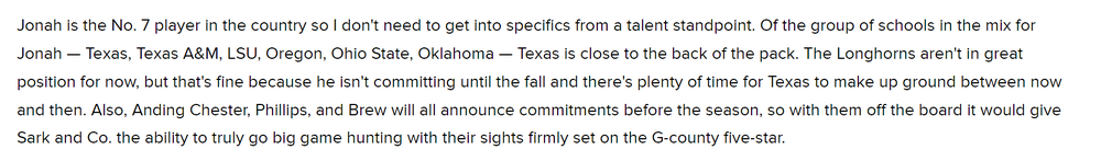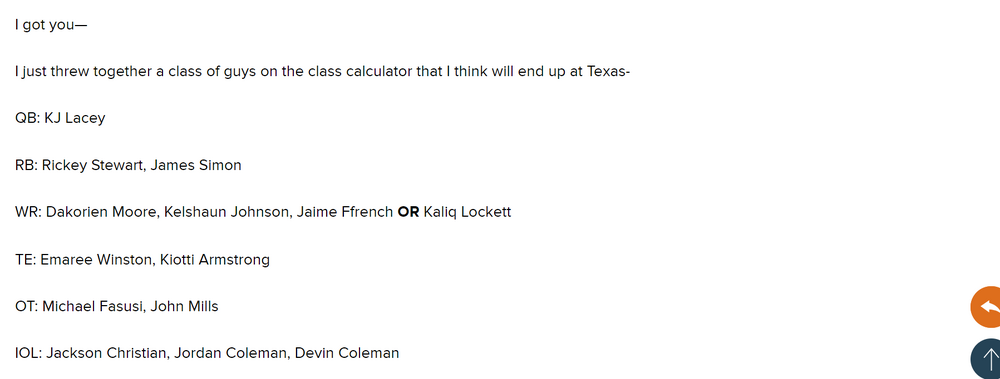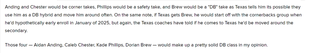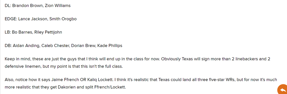Dia Bell and Troy Huhn are the two primary targets. Gerry believes our QB1 will be one of these two. But for the Elite Camp, they've invited 7 QBs. Here's the invitee list for the camp, from Horns 247. 2025 Nashville (TN) Lipscomb Academy three-star DL Amir Leonard-Jean Charles 2026 Ft. Lauderdale (FL) American Heritage five-star QB Dia Bell Harbor City (CA) Narbonne four-star QB Jaden O'Neal San Marcos (CA) Mission Hills four-star QB Troy Huhn El Paso Del Valle four-star QB Jake Fette Conroe Grand Oaks three-star QB Grant Smith Argyle Liberty Christian three-star QB Quinn Murphy Seguin QB Corey Dailey Pflugerville QB Cole Taylor Texarkana (TX) Texas High four-star RB Tradarian Ball Carthage four-star RB KJ Edwards Aledo three-star RB Raycine Guillory — Texas commit Hutto three-star RB Keilan Chavies Waco University four-star WR London Smith Santa Ana (CA) Mater Dei four-star WR Kayden Dixon-Wyatt Stockton (CA) St. Mary's three-star WR Kenneth Moore III Allen three-star WR Caleb Smith Pearland Shadow Creek WR Chris Stewart Dallas Parish Episcopal WR Jaylen Pile Melissa WR Payhton Porter Pflugerville three-star TE Jaivion Martin North Crowley five-star OT John Turntine III IMG Academy (FL) four-star OT Keenyi Pepe Killeen Shoemaker OT Troy Pless IMG Academy (FL) three-star IOL Breck Kolojay Dallas South Oak Cliff OT Cortavious Tisaby Euless Trinity IOL Pupunagatoa Katoa Pflugerville Weiss IOL Jerald Mays Temple four-star DL Jamarion Carlton Bastrop four-star DL Tiki Hola Duncanville four-star EDGE KJ Ford Duncanville EDGE Landon Barnes Carthage four-star LB Daquives Beck Katy Mayde Creek three-star LB Kosi Okpala Fort Bend Marshall three-star LB Noriel Dominguez Willis four-star CB Jermaine Bishop Temple four-star CB Jason Bradford Palestine CB S'Vioarean Martin Allen CB Lebron Bauer Carrollton (Ga.) four-star SAF Zelus Hicks Duncanville three-star SAF Braylon Edwards Fort Bend Marshall SAF Isaiah Williams Austin LBJ SAF Yaheim Riley Killeen Shoemaker SAF Karson Tutwiler San Marcos ATH Izayah Young 2027 Bastrop QB Weston Nielsen Denton Guyer QB Zephyr Kreye Rowlett QB Samuel Ioera Kerrville Tivy QB Seth Shuler Richmond Randle RB Landen Williams-Callis Brenham RB Jakoby Dixon Houston Kinkaid RB Wayne Shanks Jr. Jackson (Ala.) RB Ezavier Crowell Aledo RB Jeremiah Johnson Humble Summer Creek WR Tre Brown Bastrop WR Zachary Wilkinson Dallas South Oak Cliff OT Brian Swanson Forney OT Jordan Carraway Garland Lakeview Centennial DL Khing Thibodeaux Cy Ridge EDGE Kaden McCarty Garland Lakeview Centennial CB Montre Jackson Red Oak CB Dhillon McGee Waxahachie SAF JayQuan Snell Lewisville SAF Aiden Evans -
