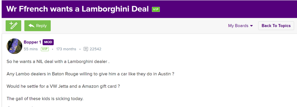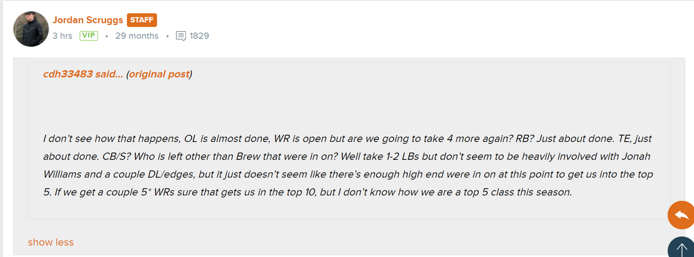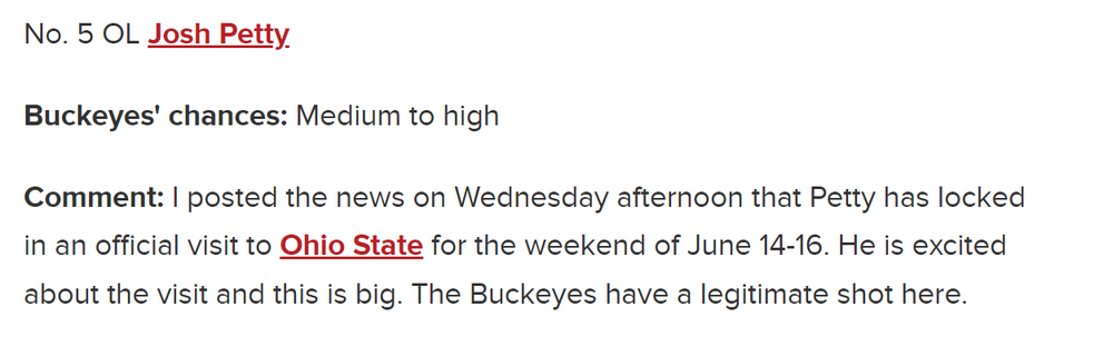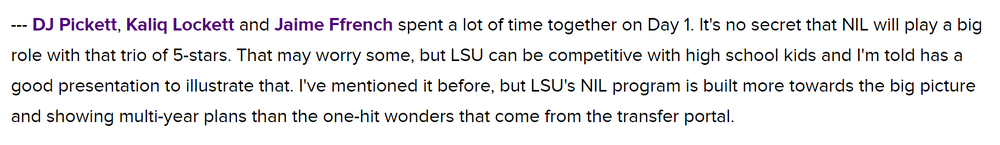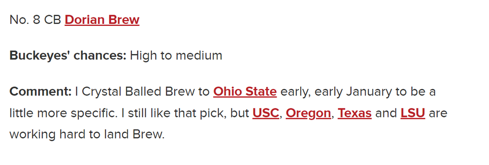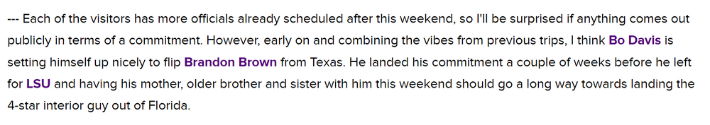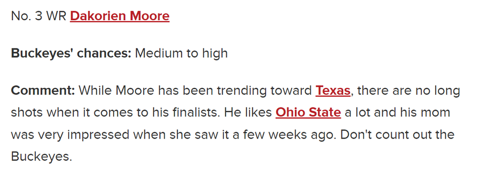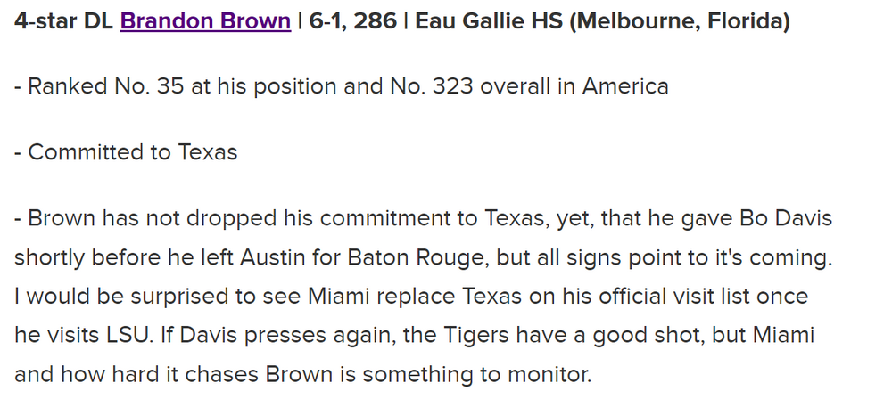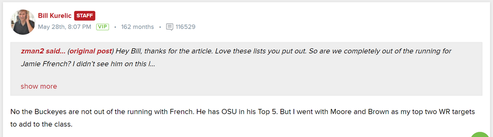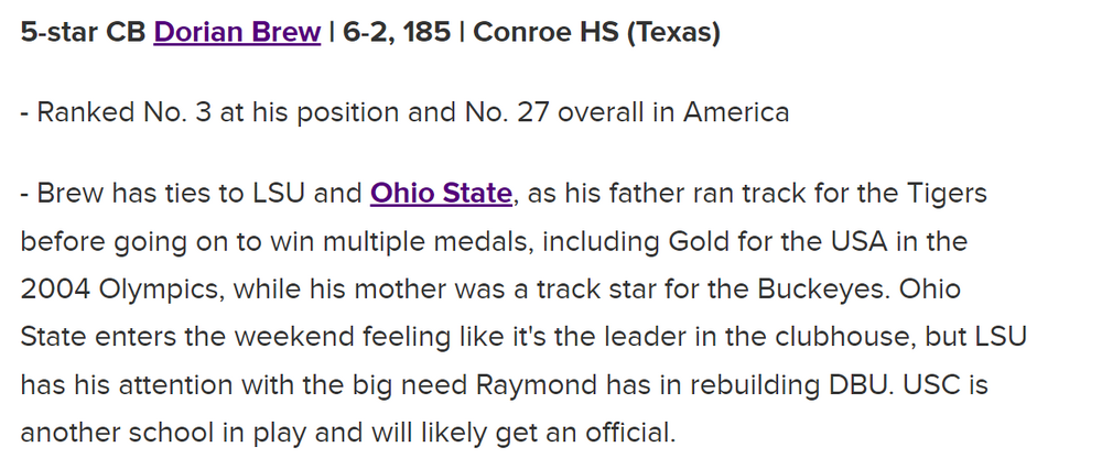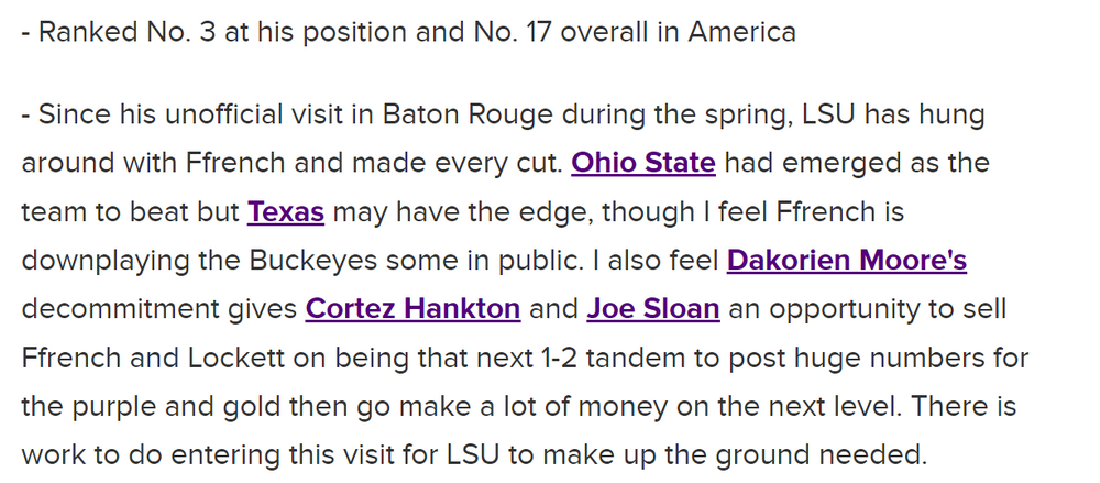 So, several key targets on OVs or visits to our rivals. Here's a look at a few of them, from rival sites. I've added commentary from their $9.95ers, if current and relevant. (In particular, note the tone and comments re: Moore & Brew (Buckeyes), and Ffrench/Brandon Brown (LSU)). Phew - tired of all the cut and paste! Also - Bo Davis and his hillbilly cajun friends can geux feuxck right off. OHIO STATE (COMMENTS FROM BUCKEYE 247) 1) Dakorien Moore (Ohio State OV) Bill Kurelic (Buckeye 247) 2) Dorian Brew (Ohio State OV) 3) Riley Pettijohn (Ohio State OV) 4) Daylan McCutcheon (About Moore, Vernell Brown and McCutcheon) 5) Malik Autry 6) Josh Petty LSU (COMMENTS FROM LSU 247) Some big targets on Official Visits to LSU: 1) Jaime Ffrench 2) Kaliq Lockett 3) Brandon Brown 4) Dorian Brew 5) Zion Williams Comments from LSU 247, on the guys above Lockett & Ffrench Jaime Ffrench Kaliq Lockett Brandon Brown Dorian Brew Zion Williams SOME OTHERS VISITING PLACES OTHER THAN OHIO STATE / LSU LSU commit Jaboree Antoine at Miami 3-star CB Aidan Anding at Miami 5-star OT Michael Fasusi at Missouri 4-star OT Lamont Rogers at Missouri 5-star LB Jonah Williams at USC 4-star WR CJ Wiley at USC -