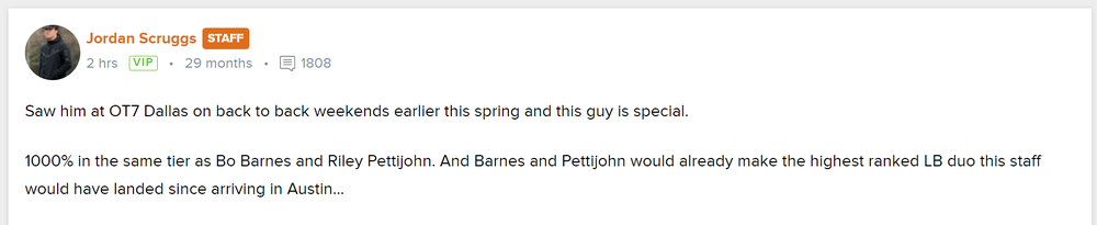 (As opposed to the usual insipid dreck, this note has tons of specifics and is well worth the read. This kid delivers.) The Stampede: Road Report from Houston The latest from a week on the road seeing a plethora of Texas targets in offseason action. Jordan Scruggs (Horns 247) -