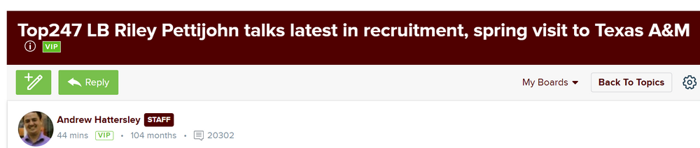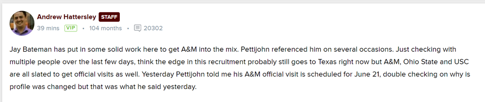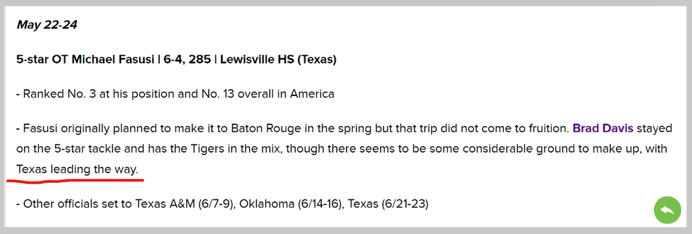 (Hattersley on Fasusi, Rogers and Haywood.) Where Texas A&M stands with top OL targets heading into June Andrew Hattersley (Aggie 247) ("Texas has been viewed as the team to beat for Fasusi for much of the spring and that still remains the case heading into June." .... "The Longhorns are still considered the favorite here but a big opportunity awaits A&M next month.") -
