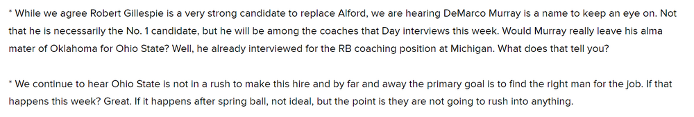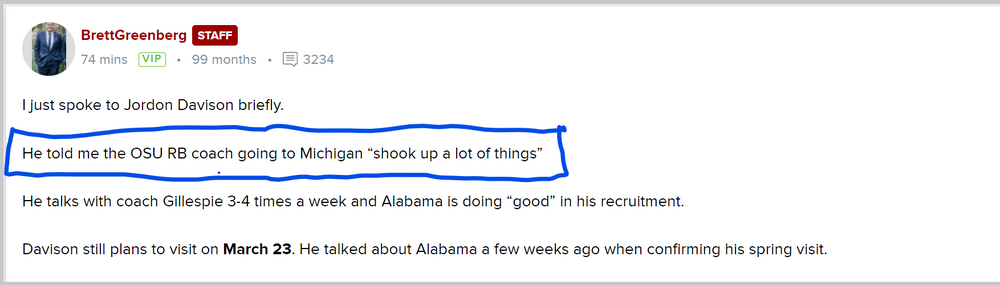 Me likey. Jordan Davison's reaction to the Tony Alford - to - Michigan news. From Bama 247. - The OSU mod says Day is not in a hurry to close on the replacement, and that they could end up going through spring without the position filled. - If that were to happen, they wouldn't have a coach when Davison and some others visit end of March ... -