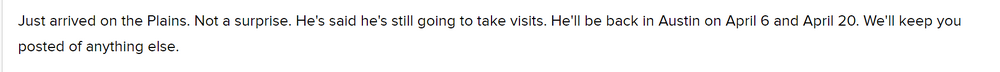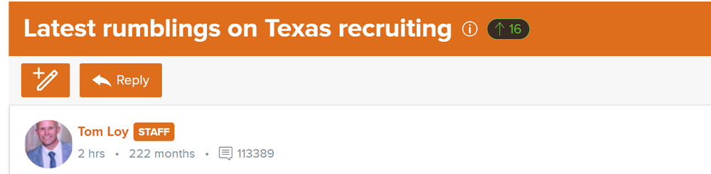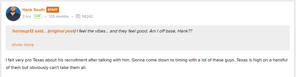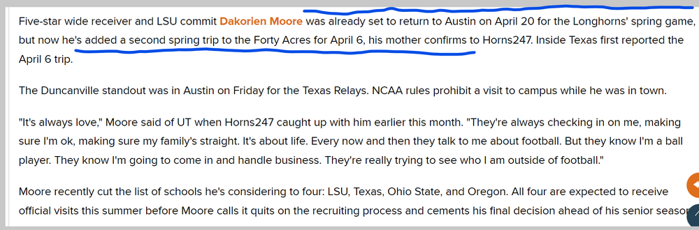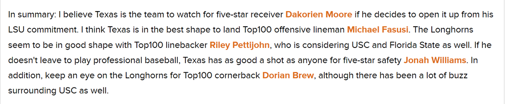 Here are some comments on practice, including some glowing ones re: the offense. What makes them interesting - at least to me - was that they came from a HS recruit on a visit. A DB prospect, at that. (CB Cobey Sellers.) (Edit: Jordan Scruggs (Horns 247)). *************************************** On Friday Sellers spent most of the day on the Forty Acres as he arrived before sunrise before leaving around 4:00 PM. "It went good," Sellers said. "I showed up around 6:30 in the morning, got some breakfast, then went to the special teams meeting and then went in the position meeting for the corners." "Most of the stuff they were learning during the meeting was tackling work and then scheme-based talk. I wasn't super familiar with it but I could tell the DBs were doing everything they were supposed to do." Besides team meetings and individual meetings, Sellers also took in a practice while on campus. "First of all the offense is great, second to none. Usually the defense is what clicks early in practices but the offense is what really stood out to me, they were clicking on all cylinders and the D-line also looked good especially the transfer from UTSA (Trey Moore), he looked really good." When asked to speak on one of the Longhorns' defensive backs that caught his eye in practice, Sellers gave praise to rising star cornerback Malik Muhammad. "Malik Muhammad. His confidence, the way he knew the game like the back of his hand, just practicing the little things like coming out of his break and opening up. To be a freshman, he's a leader on the team and it's clear when you watch him practice. He's really stood out." ************************************************* I'll post the full article in the recruiting thread.