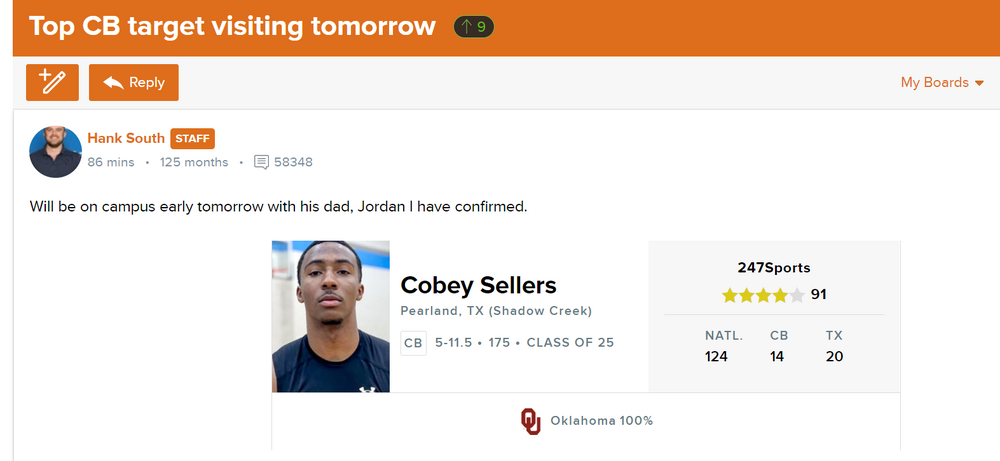CB Cobey Sellers visited. Here's a 247 article, with some interesting comments on practice. In particular, the ones on our offense. Coming from a DB recruit on an unofficial visit, I thought they were positive and authentic. (Posted the comments on practice, in the FB board practice thread; here's a snippet, and the complete article after that.) "First of all the offense is great, second to none. Usually the defense is what clicks early in practices but the offense is what really stood out to me, they were clicking on all cylinders and the D-line also looked good especially the transfer from UTSA (Trey Moore), he looked really good." (Full article.) Shadow Creek Top247 CB Cobey Sellers breaks down Friday's all-day visit to Texas Jordan Scruggs (Horns 247) -