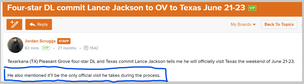 Useful list from 247 - the 31 recruits currently scheduled for OVs, plus a few more who are likely to do so. ************************************************************************************************************* A look into who Texas has already scheduled for official visits Jordan Scruggs (247 Sports) The Texas Longhorns are in the heat of the offseason. As the team preps for its first day of spring ball next week, the personnel and recruiting staff have been hard at work for weeks as the Longhorns currently have 31 official visits set with plenty more to be added once we get closer to June. For those curious, here’s a positional breakdown of the 31 recruits who’ve already scheduled their official visit with Texas. QB: 1 RB: 1 WR: 6 TE: 3 OL: 8 DL: 3 EDGE: 2 LB: 3 CB: 3 S: 1 As far as the geographic makeup of the group, 20 hail from Texas, 4 from California, 2 from Florida, 2 from Georgia, 1 from Alabama, 1 from Indiana, and 1 from Tennessee. *Recruits are separated by weekend and listed in order of their 247Sports ranking. June 7-9 weekend (2 visitors) Fort Bend Marshall three-star cornerback Caleb Chester | No. 126 in Texas Klein Oak safety Courtland Guillory | currently unranked June 14-16 weekend (10 visitors) McKinney four-star linebacker Riley Pettijohn | No. 57 NATL Katy Jordan four-star wide receiver Andrew Marsh | No. 66 NATL Shadow Creek four-star cornerback Cobey Sellers | No. 124 NATL Atlanta (GA) Westlake four-star offensive tackle Juan Gaston | No. 154 NATL Hitchcock four-star wide receiver Kelshaun Johnson | No. 180 NATL Lovejoy four-star wide receiver Daylan McCutcheon | No. 207 NATL Westlake Village (CA) Oaks Christian four-star EDGE Hayden Lowe | No. 226 NATL Bridgeland four-star offensive tackle Jonte Newman | No. 41 in Texas Tyler Chapel Hill three-star running back Rickey Stewart | No. 52 in Texas San Francisco (CA) St. Ignatius Preparatory three-star interior offensive lineman John Mills | No. 39 in California Melbourne (FL) Eau Gallie three-star defensive lineman Brandon Brown | No. 61 in Florida (Texas commit) June 21-23 weekend (18 visitors) Sachse five-star wide receiver Kaliq Lockett | No. 11 NATL Jacksonville (FL) Mandarin four-star wide receiver Jaime Ffrench | No. 30 NATL Lewisville four-star offensive tackle Michael Fasusi | No. 38 NATL Indianapolis (IN) Warren Central four-star EDGE Damien Shanklin | No. 47 NATL Jasper four-star tight end Kiotti Armstrong | No. 65 NATL San Clemente (CA) four-star linebacker Matai Tagoa'i | No. 71 NATL Spring Dekaney four-star tight end Nick Townsend | No. 104 NATL Dallas Skyline four-star linebacker Elijah Barnes | No. 109 NATL Calhoun (GA) four-star tight end Emaree Winston | No. 156 NATL (Texas commit) Saraland (AL) four-star quarterback KJ Lacey | No. 179 NATL (Texas commit) Nashville (TN) Ensworth four-star defensive lineman Ethan Utley | No. 181 NATL Santa Ana (CA) Mater Dei four-star wide receiver Marcus Harris | No. 219 NATL Port Neches-Groves three-star offensive tackle Jackson Christian | No. 60 in Texas Lufkin three-star defensive lineman Zion Williams | No. 66 in Texas Dickinson three-star offensive tackle Tyler Thomas | No. 68 in Texas Fort Bend Hightower three-star cornerback Kade Phillips | No. 89 in Texas Cedar Hill interior offensive lineman Jordan Coleman | currently unranked Cedar Hill interior offensive lineman Devin Coleman | currently unranked Footnotes: It’s incredibly important to give a reminder that it’s currently Mar. 14 and that Texas will add at least a dozen more official visitors to their summer total. With that being said, here’s a list of prospects I’m expecting to eventually make it into Austin on an official visit - Jordon Davison, Dakorien Moore, Ty Haywood, Lamont Rogers, Kamauryn Morgan, Lance Jackson, DJ Sanders, Smith Orogbo, Chace Sims, Floyd Guidry, Anthony Williams, Javar Thomas, Dorian Brew, Jonah Williams -