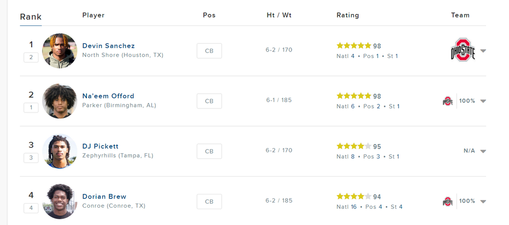 7. Could be related their recent crystal ball. They have the #1 corner committed (Sanchez), and just received a CB for the #2 guy (Offord). #4 Brew had 3 CBs to Ohio State, including that of Fong, but perhaps their prospects with Offord are changing Brew's mind.