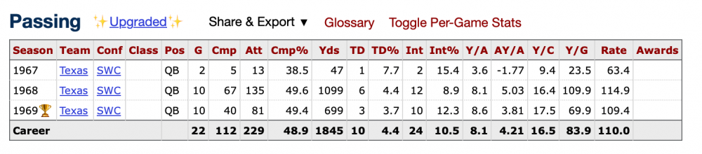I didn't watch Street play and neither did you so all I have to go by are statistics. Those don't look very good outside of wins. That includes running the football. All that being said it isn't fair to compare them because it is different eras that had completely different expectations for QB play. James Street was never asked to go dominate the other teams defense and win a football game. he was never asked to show the ball 40 times and run it 15 in one game. It just isn't a fair comparison and you know it. I already said pre-modern football he was the greatest QB in longhorn nation. What else is it you want me to concede? I can't in good faith say overall he is high on that list and I'm not sure many other people are either.