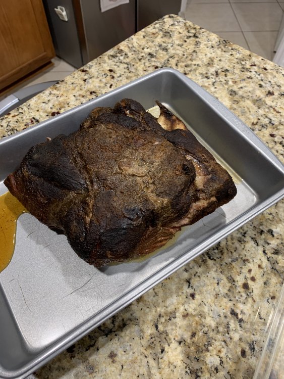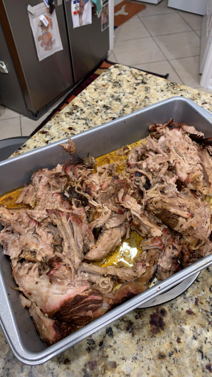 8. First cook on my new ugly drum smoker. FIL and I got a 55 gallon drum that was used to import honey with, burned out the liner, built/welded intake valves, exhaust vent, charcoal basket. Took a while to get the intakes right and get it set at 250-275 but I got it figured out now. Painted it with engine enamel spray paint. It’s called an ugly drum for a reason. Threw a pork shoulder on at 10:15 this morning, wrapped at 2:30 and am about to pull it off and let it rest for an hour and a half or so. Like this method a lot as it allows me to smoke at higher temperatures than the traeger I have. Total cost was about $120. Ordered some Weber kettle grill grates, thermometer from Amazon and used a bunch of scrap metal my FIL had lying around.