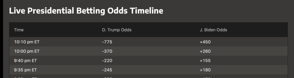 8. Biden won early votes by 25%, Trump won Election Day by 25%. Trump still -240 currently.