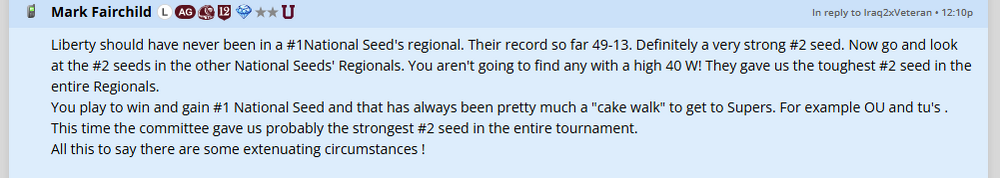 11. Collie Station Regional teams: Aggies Marist Red Foxes aggie won 17-4 Saint Frances Red Flash aggie won 18-0 Liberty Flames aggie lost game 1 8-5, won game 2 14-11, and lost game 3 6-5 Not one of the regional invitees were ranked in the top 25. Liberty did receive 8 votes. I mean, who even knows where Marist and SFU are located? Could you even name their mascots or know the team's nickname? IMO, it looked like a cupcake buffet. 56 runs in 5 games and couldn't get the job done. Evidently the roller coaster is co-ed.