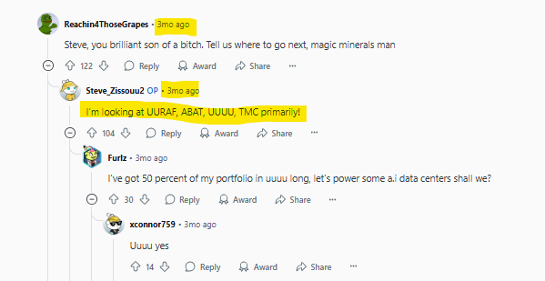 20. How many of you follow Steve_Zissouu2 on r/wallstreetbets? He's a professor by trade but makes a ton of money in the market based on news regarding minerals. He mentioned UUUU in a post 3 months ago along with UURAF, ABAT and TMC.