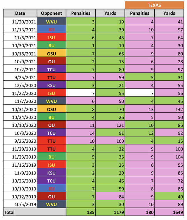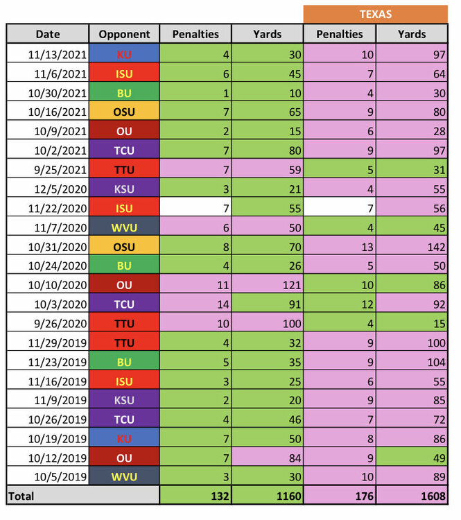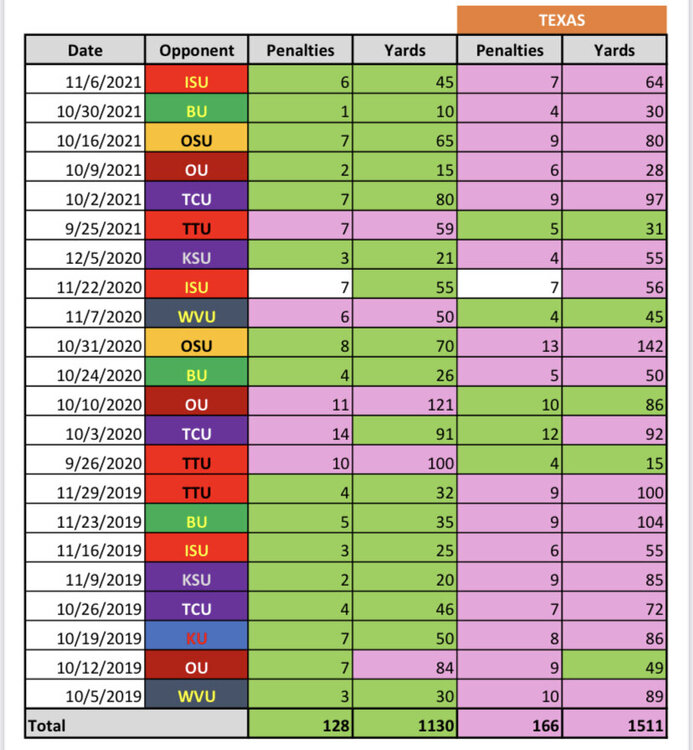 4. Just did a quick check. Last 10 non-conference games (including bowls) going back to Georgia. Texas is 3-5-2 in penalties and 4-6 in yardage. Better than our conference numbers…that’s for sure.