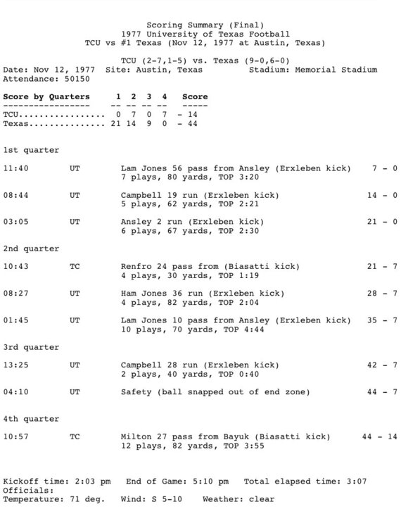 6. I was 5 years old. Just me and my Dad (Texas Ex). Watched Earl Campbell run up, down, and over the Frogs. I’ll never forget the sights and sounds of Memorial Stadium that day.