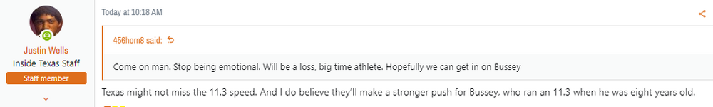 4. FWIW - Justin Wells (IT) said Texas will continue to pursue Bussey regardless of what happens with ATH Aaron Butler tomorrow. Also said Butler and Wingo played 7v7 together and have been in contact the last few days. Gerry chimed in that Butler lived in Texas when he was younger and played in youth sports there.