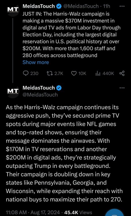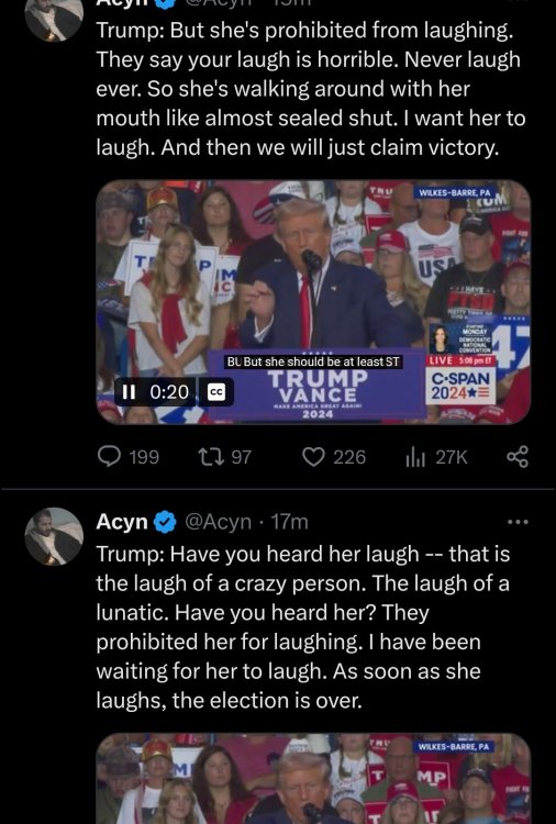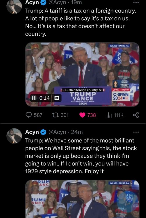 2. Wish Kamala wouldn't have mentioned price controls but that's the only misstep in the last month so whatever I guess. MAGA and the Elons of the world really running with Kamala = communism but also Putin = good. And yeah DonOld's dad was arrested at a KKK rally and Trump is having a rallying in a KKK town in Michigan next week.