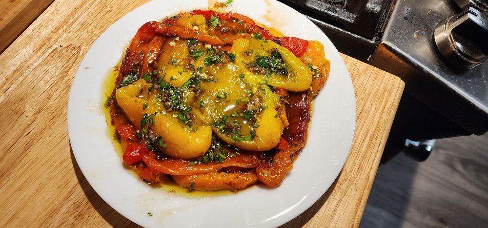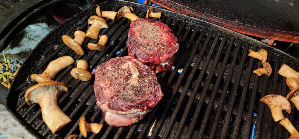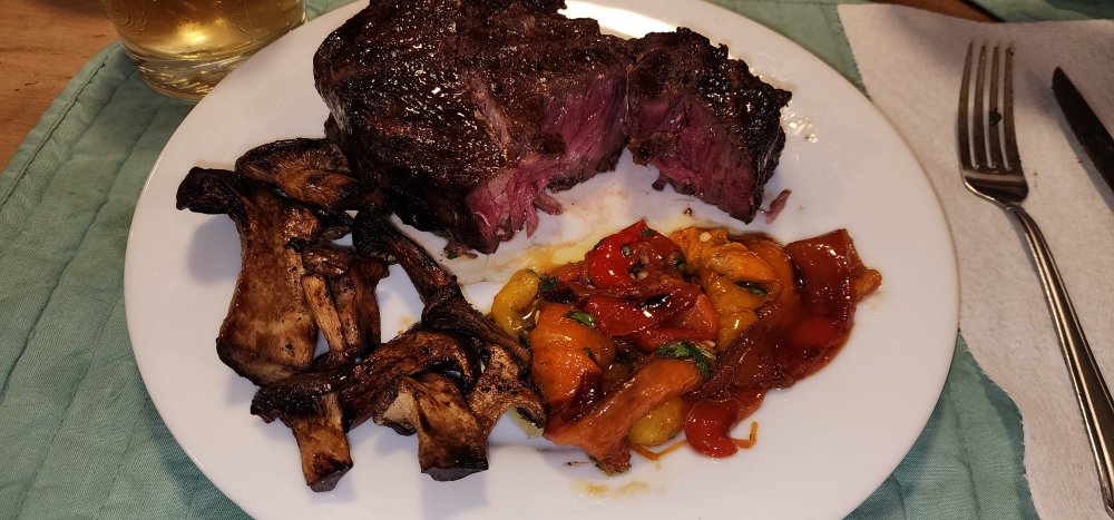 25. Prime, dry brined (48 hrs) ribeye cap steak with marinated bell peppers and grilled trumpet mushrooms.
