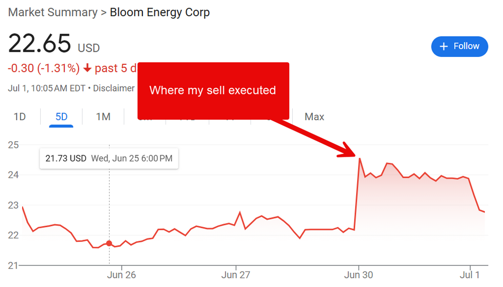 6. finally had a sell order executed on BE. I bought it like 5 years ago. it would jump every 6 months then slowly peter out. had to watch it go down into maybe 60% loss territory or something again. i had two consecutive 60 day limits up. it executed at the end of the second one. i'm out, up by a percent or two for the whole thing. feels good to just get my money back on this one.