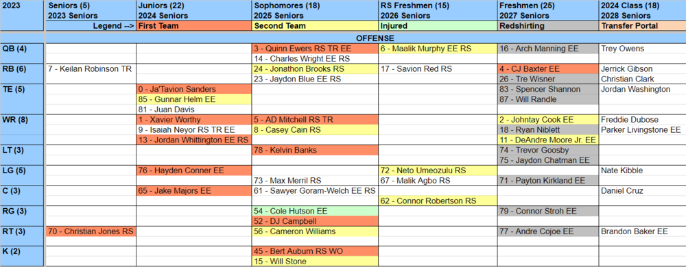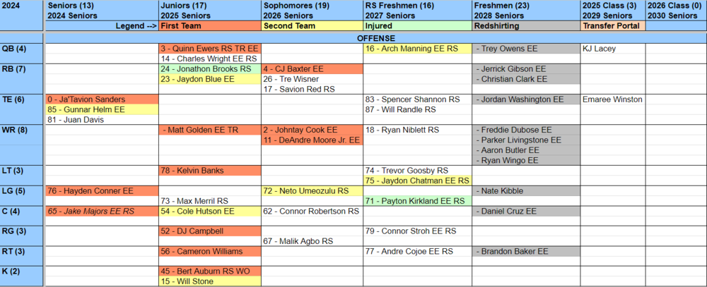 There are a lot of tabs in that file depending n your interest. If you enjoy memory lane, there's a tab for where things stood at the end of each season since 2011. There are Texas by Class and Aggie by Class tabs which shows what happened to every recruit since 2017. The Aggie Grid is an alternative to the depth chart/class style I use for Texas. It shows each recruit by class (rather than remaining eligibility) and their player rating. I don't track depth chart for Aggie since I don't follow them close enough and Ourlads.com does a better job of tracking than I could do. The Roster tab is a dump from the Texas web site and is used by formulas in the 2024 tab to update the jersey numbers. The player positions and depth chart in the 2024 tab is based on what I read on Surly, which includes a lot of speculation. When the season starts, I'll update them based on the official depth chart each week.