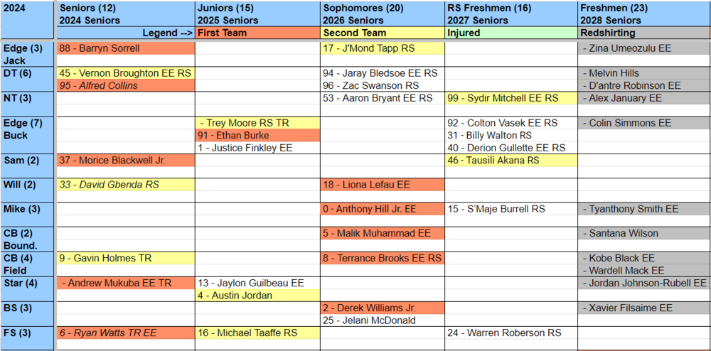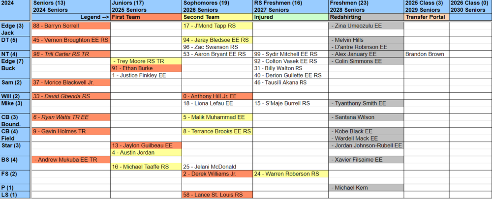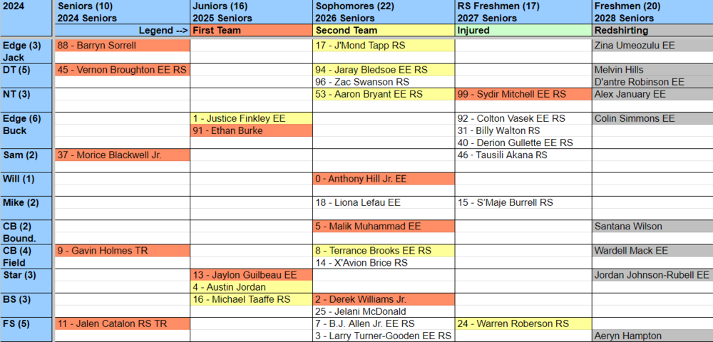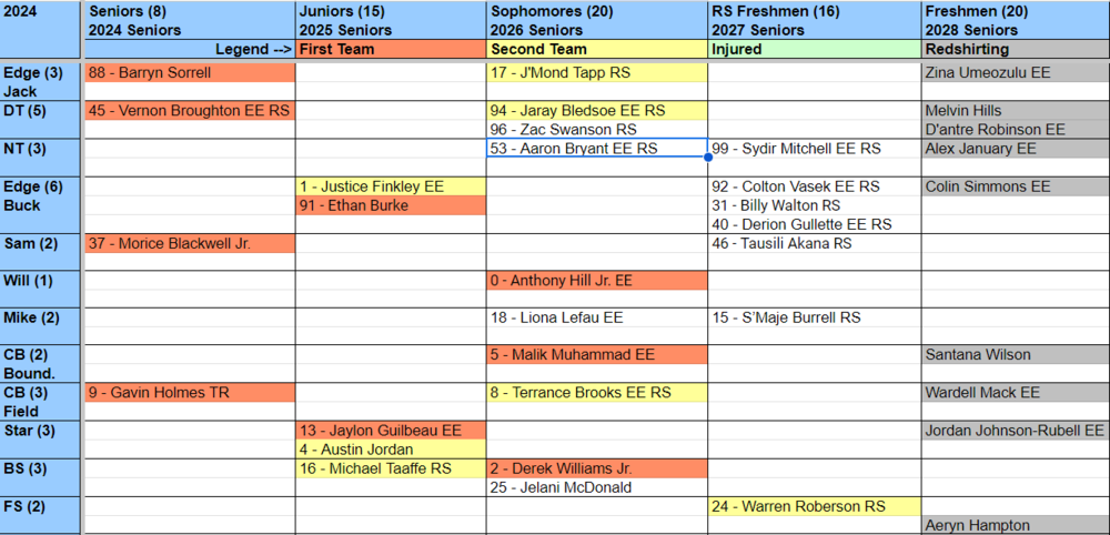 I added a 2024 tab to the depth chart spreadsheet. I removed everyone that walked on Senior Recognition Day, although some might come back. I also removed Worthy and Mitchell since they'll be declaring for the NFL. I'm sure there will be others declaring as well (Ewers, Sanders), but I'm leaving them until I see something more definitive. Not sure about the positions of the RS FR, especially Edge/Buck vs. SAM, so suggestions are welcome. Link to the 2024 sheet: https://docs.google.com/spreadsheets/d/1TzoBTIvCXfZIk7Sz3C9txMg0yPvrXyVM/edit#gid=1682239859 Here's the defense: