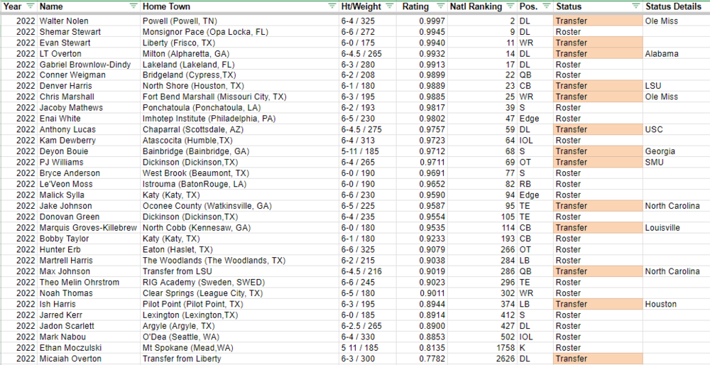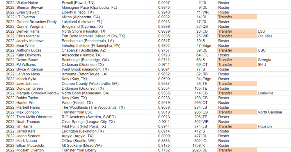 For those curious about a Where Are They Now perspective on the Aggie 2022 class, the "Aggie by Class" tab tracks the status of each recruit, sorted by the year they signed with A&M, then by rating. There's a similar "Texas by Class" tab. They both go back to 2017. I didn't include Nolen since he's not in the portal yet and GH said that Aggie was better positioned to retain him. I did include Jake and the Overton brothers since it seems like they are likely to leave and the 48 hour clock has started. https://docs.google.com/spreadsheets/d/1TzoBTIvCXfZIk7Sz3C9txMg0yPvrXyVM/edit#gid=1912575733