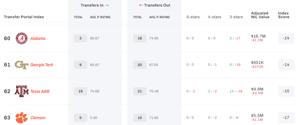 A few observations: - Aggies are at 62, which is one spot higher than Clemson which has lost 10 players to the portal and has zero commits. - There are 3 teams ranked higher than A&M that have zero transfers coming in and 7+ transfers going out. - A&M has the highest outgoing average performance rating of the top 65 teams. - The average rating of the incoming commits is #33 of 65 teams. - ON3 is saying that A&M has lost more talent/performance than they've brought in. ON3 describes their ranking as "On3's Team Transfer Portal Index utilizes the On3 (P)erformance score to measure a team’s production during the transfer process, compared relative against its roster and not a comparison against other schools. This proprietary algorithm determines if a school has improved its overall team talent, stayed the same, or declined in talent during the transfer window."
