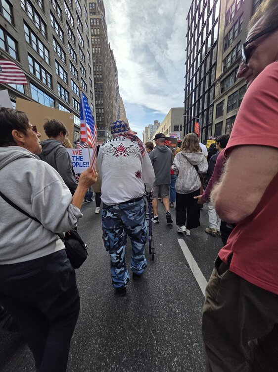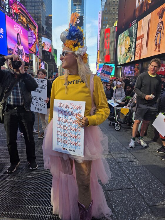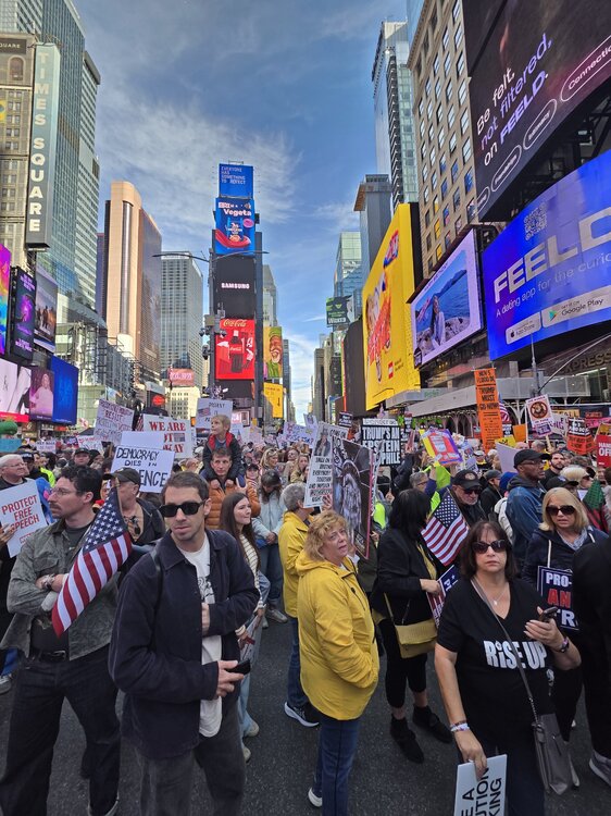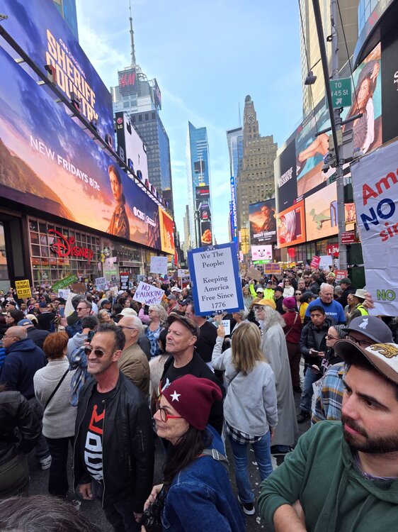 The NYPD estimate on number of protesters is probably multiple times small. The crowd stretched from 14th back to 50th or even higher along 7th Avenue. I think the first no kings was 200k. I would put this one at more than that. 250k to 350k easily. It was more crowded than NYE in Times Square. It was very peaceful, and I saw young children as well as people in their 80's.