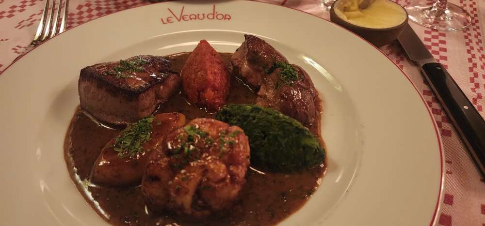 Went to Le Veau D'Or for dinner last night. Started with a Marie Antoinette cocktail. Starter was Escargots Provencal. Main was the Delices Veau D'Or (offal in mustard sauce). Finished with riz au last. Had a great bottle of wine with my meal. If you get a reservation...go. -