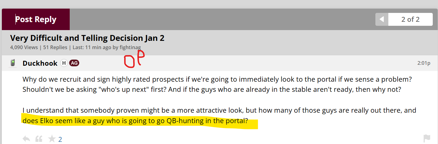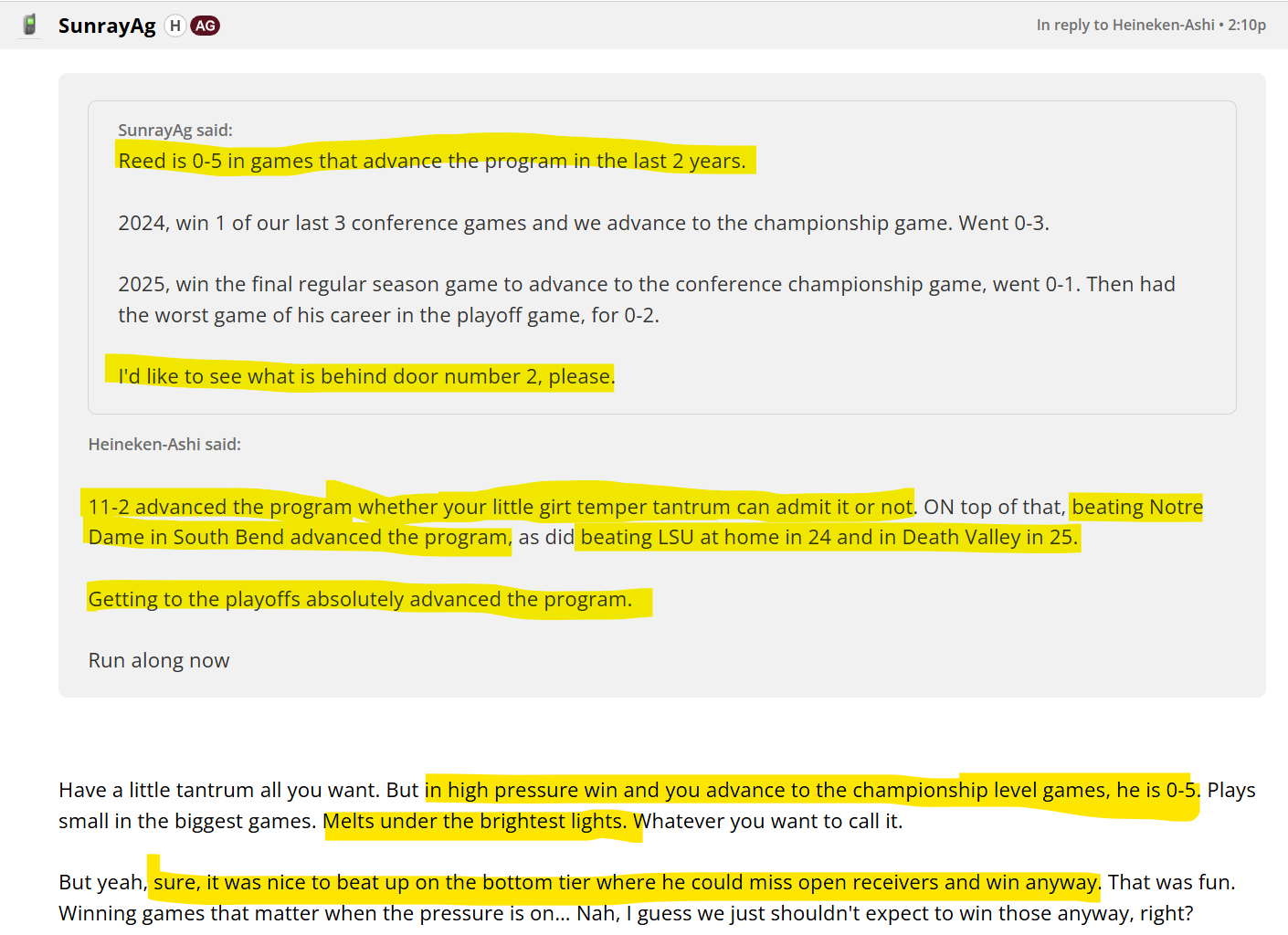 William! Stepping out into the open in writing! Long time, no see. Your English, with one odd exception, is pretty good here. You're welcome for the helpful hints. 1 Presumably this high-profile player is Reed. I guess if you're referring to College Station alone, William is correct on this one. It's been a long fall from the Heisman campaign at mid-season. His profile nationally is sort of like his profile when he's scurrying around his terrible big linemen: puny. 2 Who is William quoting? 3. Ya gotta know the man and his meticulousness. It's infused in every aspect of his life from the way he dresses to the level of fitness he maintains. Mike Elko is something else. He thinks a lot about things. Things like replacing his coordinators. Things like generating an offense against good teams. I think he really spent his meticulous time working out that boffo extension before the gas ran out on the dream mobile. Keep fluffing, William. Keep fluffing.
