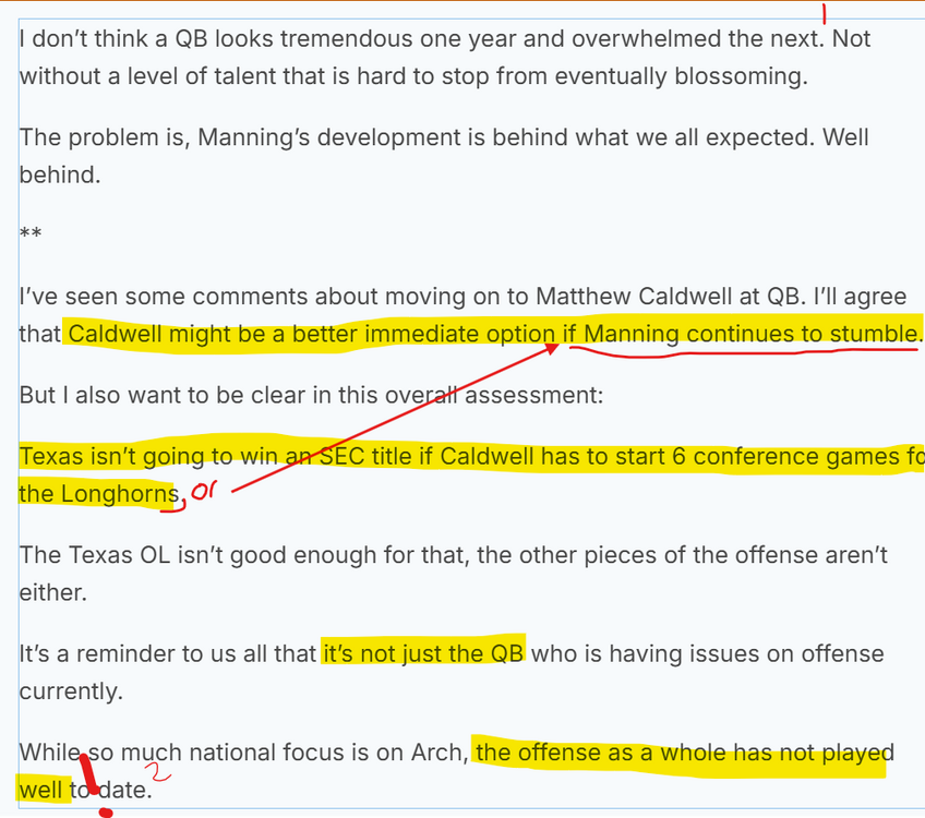 1. Was he actually "tremendous" last year? He was solid again so-so competition and absolutely useless against Georgia. That's not so bad for his first starts, but it's not really "tremendous." It seemed so to many of us, me included, because we thought it portended the greatness we expected. A more effective QB such as Caldwell could prove to be may not win 6 SEC games, but he's a better option than a less effective QB. 2. Maybe the offense needs a dynamic leader whose effort and performance lift the whole unit. I think the notion of a QB "willing" his team to win is sportswriter idiocy, but they can damn sure lead their team to higher performance. It's in the fucking job description. Again, I'll refer to Randy McEachern in 1977. The best player based on current performance needs to start at every position on the field. It's the only criterion to use for success. We'd be crazy not to give Caldwell substantial playing time against Sam Houston. We can't put all our chips on what we've seen so far from a great guy who just isn't cutting it. -