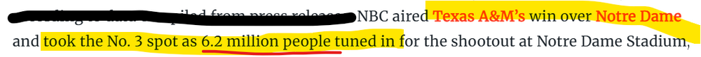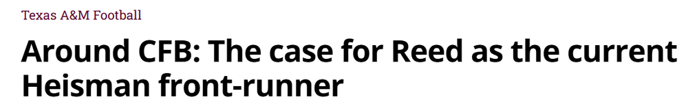 I thought this thread might die. Olin's work has been pretty solid lately and Aggies are gleeful. But my man steps up into the breech! Theme? Check! See if you can spot it! Rending of coiffure! Let's see what Slim Pickens thinks: https://youtu.be/U4qIJkKy-00?t=114 And why is Olin referring to hair six times using six paragraphs of wit? He makes the case for Reed as the front runner for...well...you know. Let's check his reasoning: The wins? You betchum. The stats? The frontrunner (the guy in front!) is eighth. I'm sure Olin will show why that is enough. The entire nation watching his Heisman moment? That's a lot of people. But A&M played at night. Olin knows his shit. Let's check the colosal numbers when the entire nation watches. Cue night time ratings! Uh, Olin? I'm guessing they left off a couple of zeroes there, Olin? And about that # 8 ranking for ND. I bet they didn't fall far after losing to those Fightin' Texas Aggies from Texas led by the Heisman front runner, huh? We won't even talk about that holding no-call during that Heisman Moment. So, how does your man compare? Stats, wins, Heisman Moment. That total yardage ranking (8th) must be dominant! Yep. No softies on that Aggie schedule. Juggernauts all the way down! That win against winless ND trumps everything else! Let's knock down another contender, you sly boots, you! Not nearly as impressive as beating the number 24 winless Fighting Irish who got out-fought by the Fightin' Texas Aggies. You're selling me on this front-runner shit, Olin! Pretty good, huh? You bet! 1. For God's sake, you beat UTSA and Utah State. Cut this shit out. 2. Now #21 ranked Michigan which has two wins unlike winless, #24 ND. You're shit is weak, Olin. Allow me to retort Allow you to go full Aggie is more like it. I deal in hope. Noted. More Aggie-ism It's a play a lot of QBs make. It's only novel for Aggies. Just as you overstate the significance of winning away. Other teams manage that more than once a decade. Perspective. Now bring it home you theme-creating wildcat! -