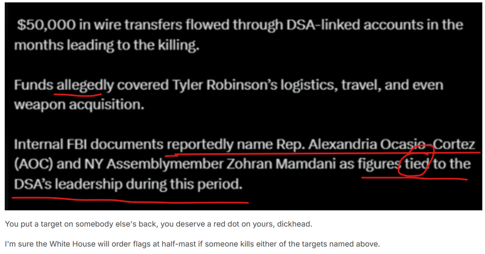 The great victory of their narration here is that the focus of the story has been deftly shifted from the turd that Kirk was to using the motive of the killer to sanctify Kirk in spite of his excremental actual history. It doesn't take much to distract the simplistic vision of the major news media from the big story of what it means that the GOPs are celebrating this hateful fascist to the less relevant story of the politics of the shooter. Anti-republic party: We need two things: A rallying point for a new surge of hate to justify furtherance of fascism. A distraction from the surprising problem of Epstein. Luckily for us, somebody shot a fuckwad that we can make into a martyr! Strategy? With remarkable swiftness: Define Kirk before the bumbling media can. Flags at half mast. Vice presidential conveyance of the saint's body to DC Moments of tearful silence and prayer. Swear bloody vengeance. Blame the radical socialist's history of violence which we've all seen (talk about shameless lying!) Specifically, go after trans-sexuals who are invading bathrooms and crowding women out of women's sports. "They're killing us all!" Announce crack down on (criminal persecution of) illusory socialists and trans-sexuals to protect our precious bodily fluids. Keep flooding the zone. Wonder why nobody is trying to stop us. I just assume it's working. I'd be delighted to be told that I'm missing out on the big backfire. -