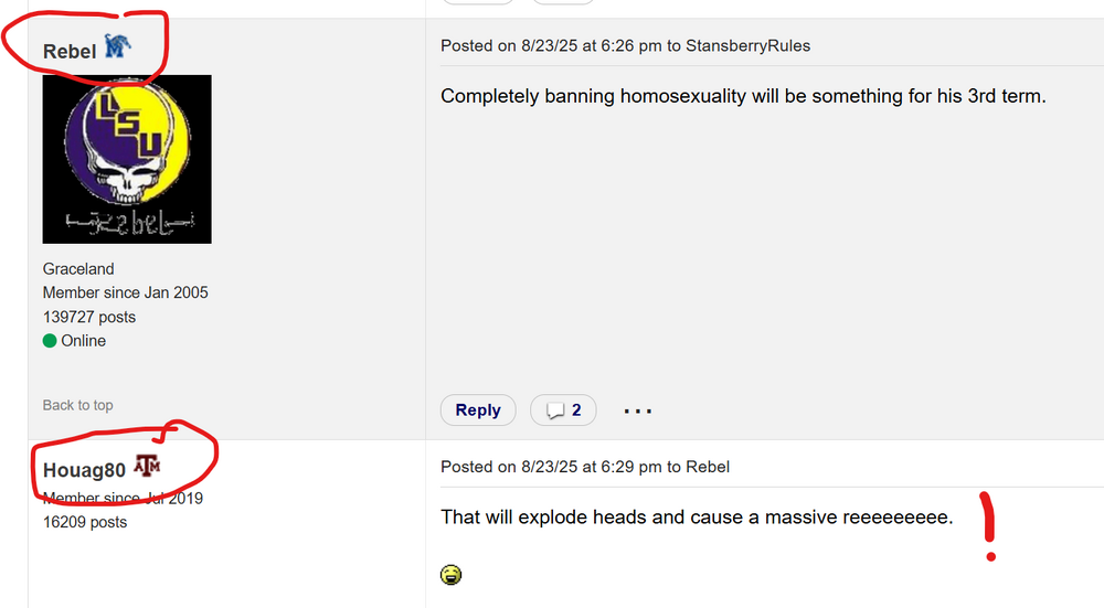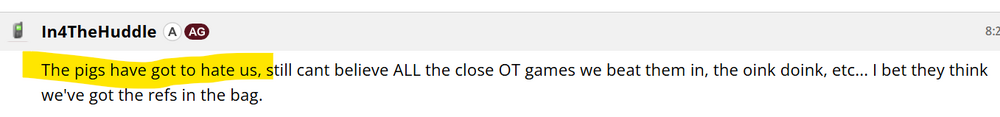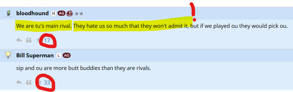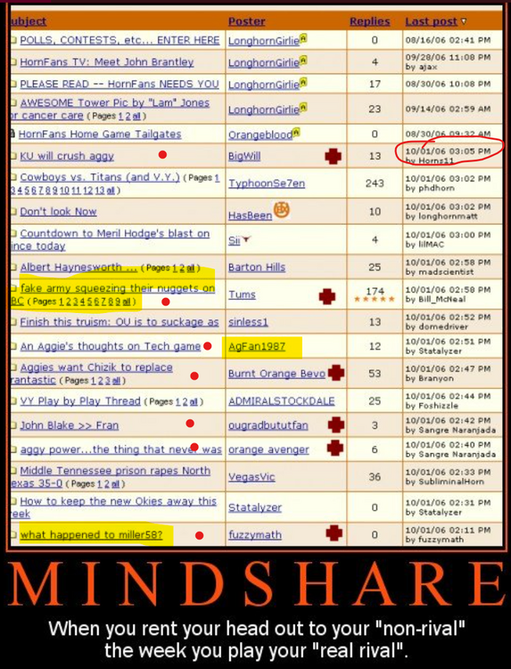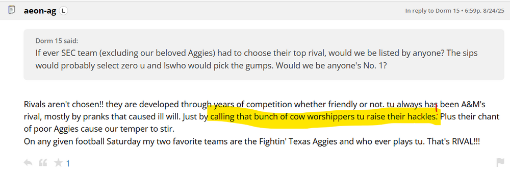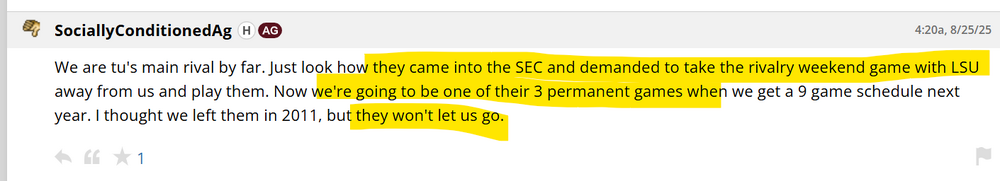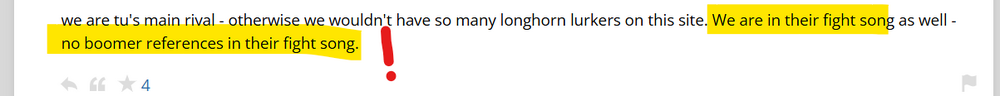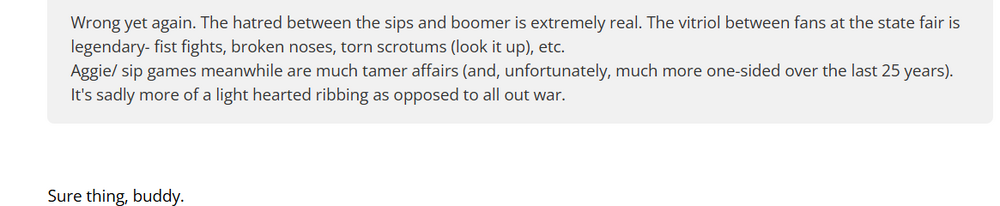 Something only the Aggies worry about. We all know where this is going. And, on post number 6, it arrives. Has anyone ever seen a concern anywhere else about one's status as another team's rival? This is a perverse version of stolen glory. We are not glorious through achievement; we're glorious because we are the most despised of a glorious opponent! That they see no meaning in the proportion of one school's fight song mention of them, which is sorta dismissive, and their own War Hynm (fuckin' war hymn, man. fuckin' serious shit!) which is dedicated to their hated rival and even choreographed is so indicative of their beloved delusion. This guy loses sight of the question: As I sort through my raised hackles, I must point out that there are posts recognizing OU as our likely main rival. I've never spent a minute fretting over us being theirs when they were in the middle of their exciting competition with Nebraska back in the Big 8. I doubt Arkansas cares if we consider them our number one rival. Texas and Arkansas, in these cases, don't identify themselves by their importance to a school they hate. But back to pathology: Where's the pathology? you ask. The man's evidence: A meme from 2006 with a screenshot of Hornfans. Seven references to A&M. One is written by an Aggie. I think Miller58 was an Aggie poster, but I don't remember if he posted his crazy shit on HF or T-Ags. One is about the famous nut-squeeze event from their Tech (loss at A&M, 31-7, pirate soldier game). Tech won with a td with under 1 minute left. Testicles squeezed in vain. Sad. And various ridicule. 2006. It's not psycho at all to keep this crushing bit of evidence at hand! Some Aggie boilerplate: Pitiful hope about Arkansas: Everybody despises you. That's not the same thing as hate, my Aggie friends. Most only think of you on game week nowadays. -