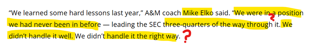 Okie dokie. Olin collects the wisdom and articulation of Coach Ivy League Grad. Olin. I feel a theme coming on. Amaze me. Prey. Noun-verb thing. Fairly promising. Compliments. Eat a dick. I've rankled. I "pray" you don't hate me forever. I don't get it. Let's proceed, shall we? Bam! Hunting. Work it, Olin! * At the end of the year, LSU was ranked second! And it was still an upset victory for 10th ranked A&M! Standby for gangsta reversal of mood. Cue Ice Cold Olin: Day-yum. Truth bomb and rhyme. You gotta give me something, bro. This actually reads like writing. Save me, Olin! Roma asks for a miracle. Olin gives him the F B I The Elk. Sooo, Elko displays his thorough knowledge of A&M football history. They were in a totally new position. Starting fast, flying high, and, then, shockingly, the flaming spiral to 8-4. Nobody saw it coming because the dear old Texas Aggies from Texas had never been there before. Didn't handle well or the "right way?" Astounding the world, the Aggies emerged from their heroic victory over the Bowling Green Seniors primed for greatness, and... Like Alanis says, you learn. You "learn" that you play football games to finish a season. Keen insight. Next year, we learn that winning some of them might be important, too. It's a steep learning curve in College Station. Coming up on 90 years. Hunted? Everybody saw A&M as their Super Bowl. Of course. I guess the learn thing works for Elko. He doesn't know how to win a natty like Jimbo does. Olin's got his hooks in this week's theme: Bam! Deduct points for no chip on the shoulder. Shrewd understatement with "a little bit." I Vee League. Sick burn, Olin. tee hee hee, sippie. Time to pump Reed: That LSU victory maybe plays just a little bit too heavily in assessing last year's team, my friend. Why do this to yourself, Olin? Suggesting Reed is Lagwayesque or even superlagwayesque? Really? Lagway's last five games reg season (didn't play us) Winning Reed's Losing Just stop. Nobody wants to trade Lagway for Reed. I skip some of the usual babble to get to this week's Elko Mysterious Sentences and, of course, Olin's big finish: 1 Ad nauseum is not a good thing, you know that don't you? 2 What team? What are you talking about? 3 Have it tatooed on your wrist so you can roll up the long sleeve of your baby nightshirt and see American football. 4 There it is! The annual chip of victory! And it's a strong chip! It's a gym rat chip! Olin brings another one into port. -