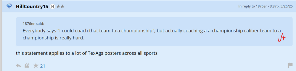 Here we have the strength of Aggie reasoning followed by.... ...the classic Aggie tale about every outgoing coach. The new guy will have them showing up to practice on time, fielding grounders, swinging two bats to warm up, and spitting without hitting their uniforms. A whole new deal! This genius, Aggie-like, falls in line: *No, you don't. Default to the traditional fictions about virtue. Last summer these guys were heroes and true Aggies because they stayed. Now? Not so much. Marvelous: 1 Captain 2 Conjugation. 3 We all aspire to be the person in charge of the command. 4 Aggies never simply lose. It's resent, you moron. -