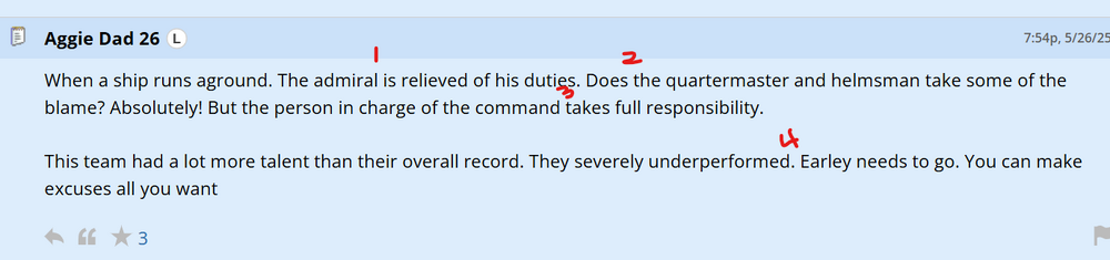 They're going to make him earn his millions. When everything went to shit and they were taking another drubbing, Earley looked resigned. I imagined him thinking, "This is humiliating and awful. Just make it to the end of the season and it will stop. And I will be a millionaire." Nope. Aggie gonna make you go through it again. What a kick in the gut. -