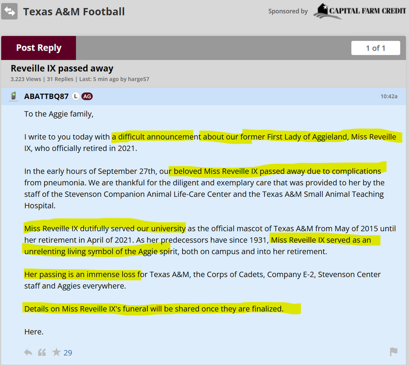 A moment of respectful silence for Miss Reveille's service. Shall we carpool to the funeral of a dog? Will Miss Reveille lie in state.