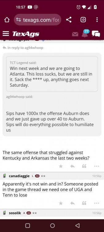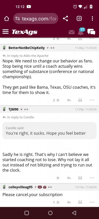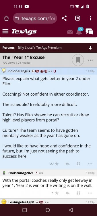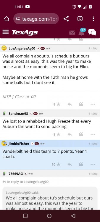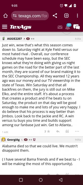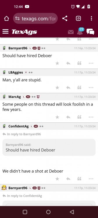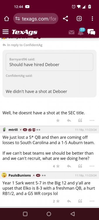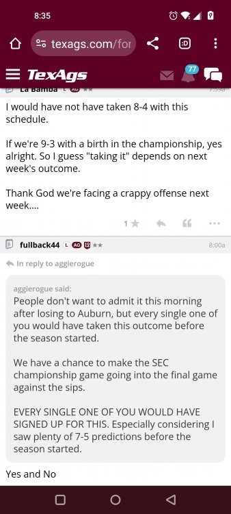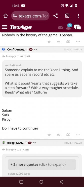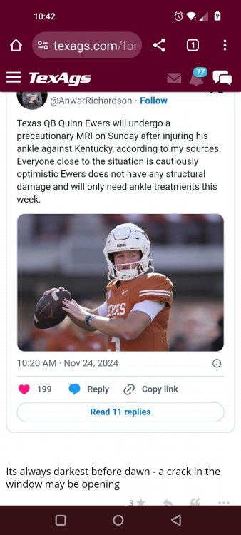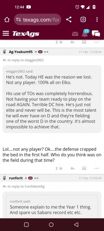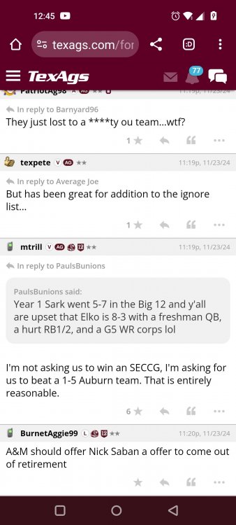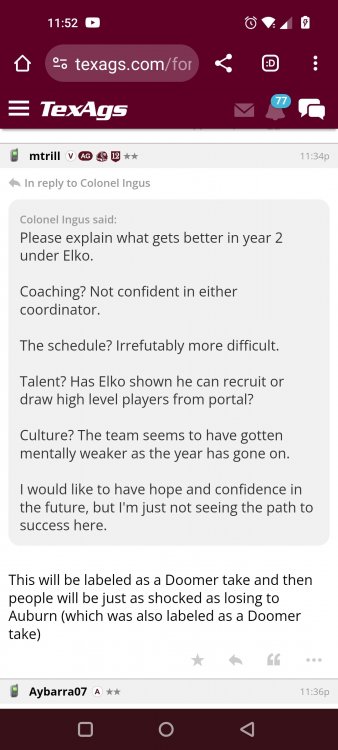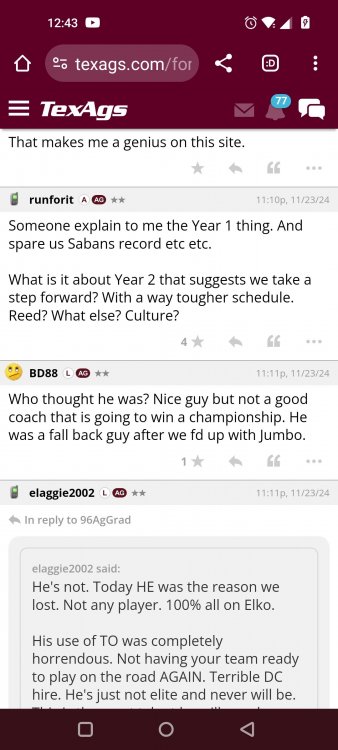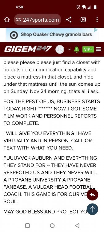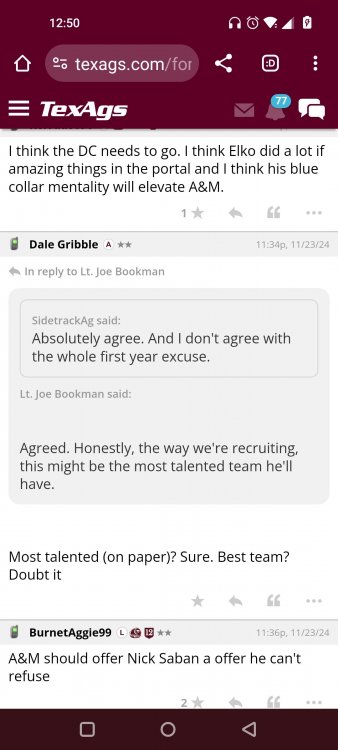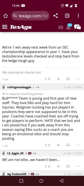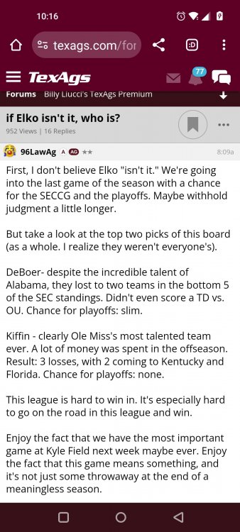 Texas A&M Recruiting 2025: The Land of Melk & No MoneyLonghornfrenzy replied to texifornia's topic in 🤫$9.95🤫 Ph By Billy Liucci After falling behind 21-0 at Jordan-Hare, coming all the way back to take a 31-28 lead only to fail to put Auburn away and eventually lose it in overtime, the Aggies had finally run out of chances. A season that sure felt like it would be a rebuilding experience in year one under first-year head coach Mike Elko following a game one loss to Notre Dame saw this A&M team show steady in-season improvement. Despite uncertainty at quarterback, the Aggies found themselves alone in first place in the mighty Southeastern Conference after racing out to a 5-0 start. Seven straight wins, including taking down a pair of top-10 opponents at Kyle Field. After disposing of Missouri and LSU in rousing fashion, all that stood between Texas A&M and the ultimate showdown with the Texas Longhorns were a couple of dangerous but certainly winnable SEC road dates. Then the Aggies traveled to Columbia and ran into what turned out to be (and still is) a white-hot South Carolina team. A&M laid an egg as the Gamecocks pulled away during a dominant 24-0 second half. As it turns out, all that cost the Ags was their short-lived top-10 ranking. Why? Because 2024 is the wildest season of conference play in SEC history. Following a bye and a tuneup against New Mexico State, all that stood between the Maroon & White and a win-and-in, lose and you're out season finale with Texas was a trip to The Plains to take on a 4-6 Auburn squad. The Tigers entered last night's game just 1-5 in league play, and the folks at Auburn were hoping to roll Hugh Freeze out of town more than they were expecting to roll Toomer's Corner. Based on 10 games worth of evidence, the Aggies were clearly the better team heading into last night's contest. But what Elko, me, you, the college football media, Nick Saban and Vegas (what was always a very fishy line moved all the way down to A&M minus-1 at one point) all knew was that this one was more than a simple “trap” game. No, the Tigers had clearly been playing much better ball of late, and as Saban put it, Jordan-Hare Stadium is “haunted.” After watching A&M's last two trips there, I'd certainly agree with the GOAT that the home of War Eagle is a house of horrors, especially at night. Combine that with the fact that, like Shane Beamer at South Carolina, Freeze fields a team that can match up on generally even footing with the Aggies in terms of raw talent, and that's especially true on defense and at the skill spots. Long story short, Elko and everyone knew the Ags' margin for error was razor-thin on The Plains. Anything less than A&M's best was sure to put the stakes of what would otherwise be the most anticipated regular-season game in Aggie history in jeopardy. The Tigers entered the final two games of the regular season looking for bowl eligibility and to play spoiler. With dates against No. 15 Texas A&M and then the Iron Bowl on deck, everyone in orange and blue entered Saturday believing something special was in the air, so the Ags were clearly on high alert entering the 6:30 p.m. kickoff. However...somehow, someway...Elko's bunch wasn't ready to answer the bell. Like in Columbia, the Aggies got hit in the mouth early and needed a standing eight count before responding. Down 14-0 at South Carolina after just two possessions, the Ags dug themselves an even deeper hole last night, falling behind 21-0 just two minutes into the second quarter. And though the Ags showed incredible fight, toughness and heart in climbing back into the game and eventually taking the lead before falling in four overtimes, falling behind by three touchdowns set the stage for disaster in the very early going. Even so, everyone on the team flight home was likely rehashing the number of missed opportunities down the stretch, any of which could have changed the 43-41 outcome had the Ags capitalized. Promising first-quarter drives that ended in a missed field goal and a red zone interception. A shanked Auburn punt that set the Ags up past midfield just before halftime. Failing to turn a 15-yard field into seven early in the fourth. A dropped snap on first-and-10 while trying to execute the four-minute offense and go home a winner and a couple of disastrous drops, one that could have gone a long way towards ending the game in regulation and another that would have extended it to a fifth OT. Another overtime error came via a very costly holding call, which turned a second-and-2 17 yards away from a walk-off win into a first-and-20 from the 35-yard line. And, of course, there was Auburn's game-tying, last-second score, a 15-play march that saw Payton Thorne lead the Tigers 75 yards thanks in large part to a 25-yard scramble on fourth-and-2. Change any of those outcomes, and the Aggies win despite falling behind 21-0 on the road. By roaring back against the Tigers, the Ags would have set Saturday night in the SEC ablaze while setting the stage for an epic rivalry renewal at Kyle Field. But the Aggies ran out of chances and dropped a second straight SEC contest in a bitterly disappointing fashion. Elko and his team knew winning at Auburn was a must if they wanted to keep their SEC title and playoff hopes alive. Or so we thought. As it turns out, the Aggies have not run out of chances, thanks to the fact that virtually the entire league — including the contenders — have suffered through nights like the ones A&M did in Columbia and at Auburn, including two other chaos-inducing upsets on the penultimate Saturday of what's been an absolutely bonkers regular-season. Ole Miss, Lane Kiffin and Jaxson Dart were left in tears at The Swamp by none other than DJ Lagway and the coach not-so-affectionately known as “Sun Belt Billy.” At the same time, the Tide (led by another former Aggie QB target, Jalen Milroe) got rolled in an embarrassing manner yet again, this time by Oklahoma. While the Ags