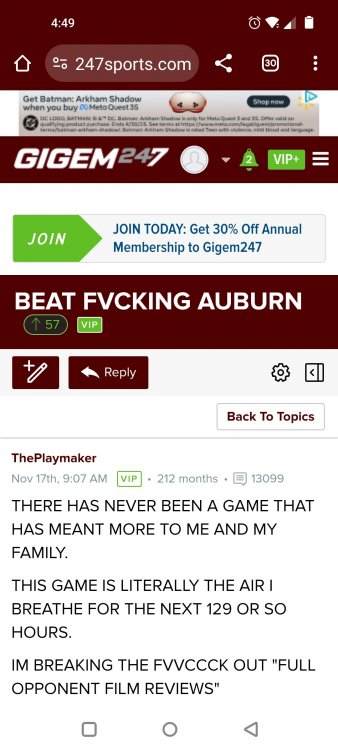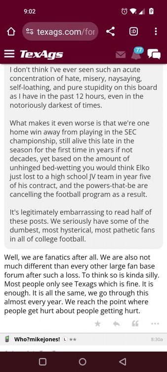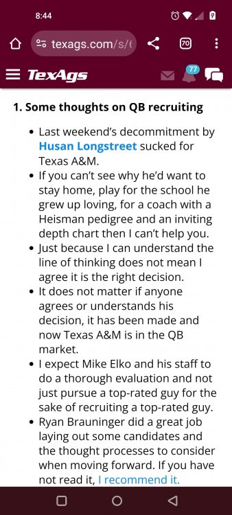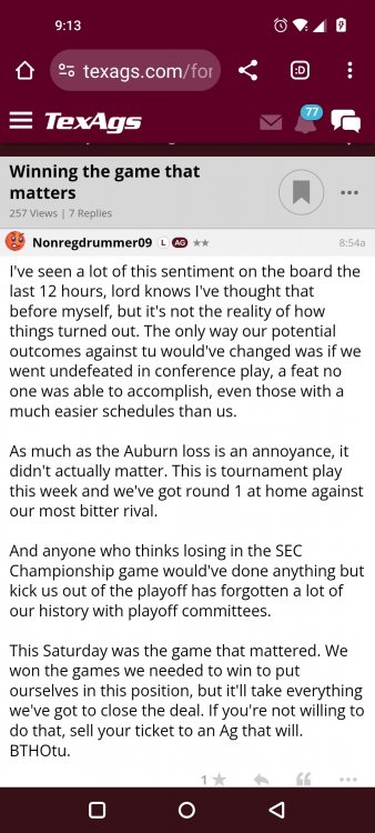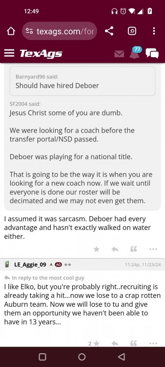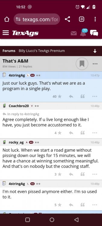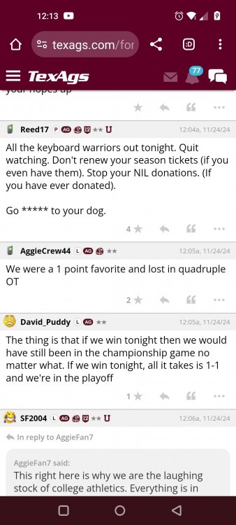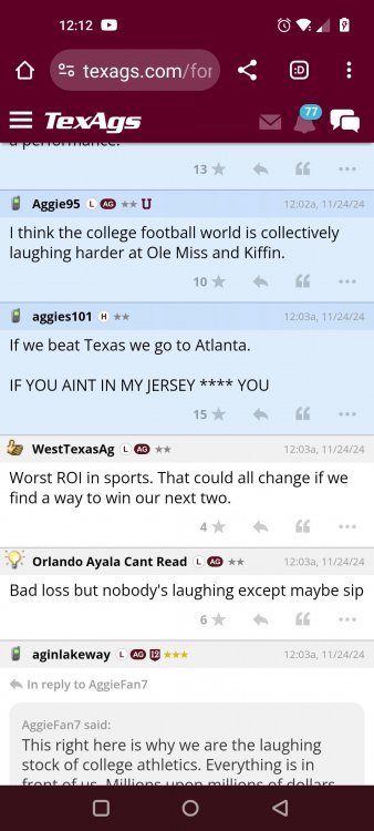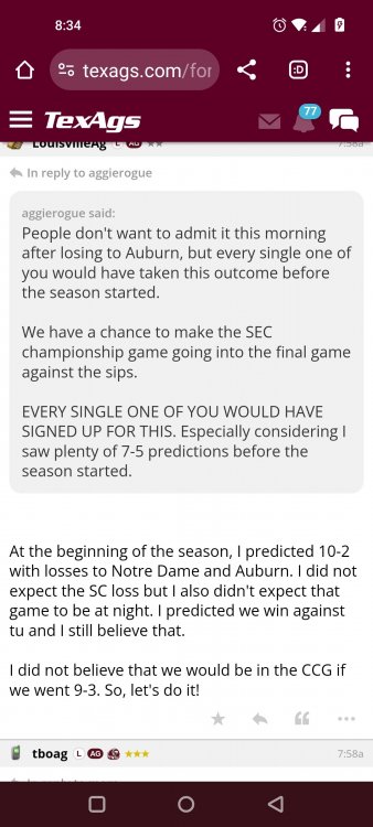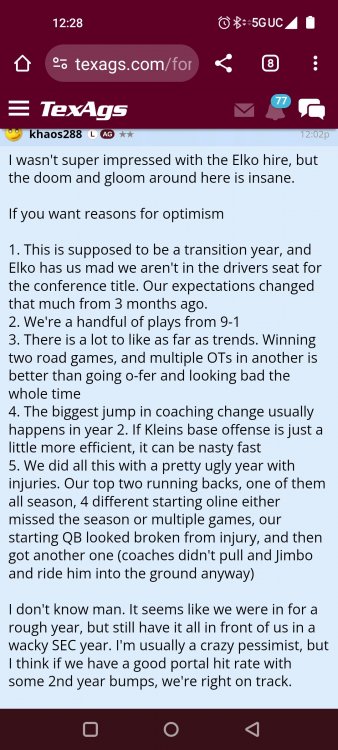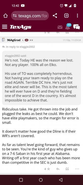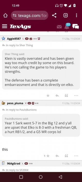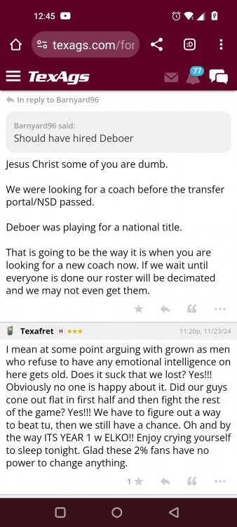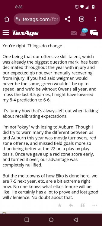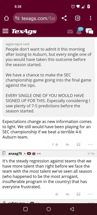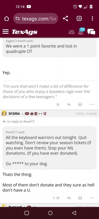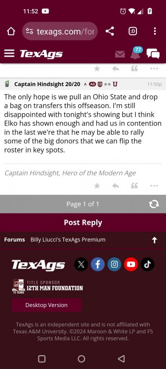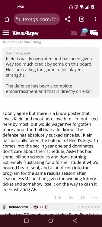 Texas A&M Recruiting 2025: The Land of Melk & No MoneyLonghornfrenzy replied to texifornia's topic in 🤫$9.95🤫 Ph By Billy Liucci After falling behind 21-0 at Jordan-Hare, coming all the way back to take a 31-28 lead only to fail to put Auburn away and eventually lose it in overtime, the Aggies had finally run out of chances. A season that sure felt like it would be a rebuilding experience in year one under first-year head coach Mike Elko following a game one loss to Notre Dame saw this A&M team show steady in-season improvement. Despite uncertainty at quarterback, the Aggies found themselves alone in first place in the mighty Southeastern Conference after racing out to a 5-0 start. Seven straight wins, including taking down a pair of top-10 opponents at Kyle Field. After disposing of Missouri and LSU in rousing fashion, all that stood between Texas A&M and the ultimate showdown with the Texas Longhorns were a couple of dangerous but certainly winnable SEC road dates. Then the Aggies traveled to Columbia and ran into what turned out to be (and still is) a white-hot South Carolina team. A&M laid an egg as the Gamecocks pulled away during a dominant 24-0 second half. As it turns out, all that cost the Ags was their short-lived top-10 ranking. Why? Because 2024 is the wildest season of conference play in SEC history. Following a bye and a tuneup against New Mexico State, all that stood between the Maroon & White and a win-and-in, lose and you're out season finale with Texas was a trip to The Plains to take on a 4-6 Auburn squad. The Tigers entered last night's game just 1-5 in league play, and the folks at Auburn were hoping to roll Hugh Freeze out of town more than they were expecting to roll Toomer's Corner. Based on 10 games worth of evidence, the Aggies were clearly the better team heading into last night's contest. But what Elko, me, you, the college football media, Nick Saban and Vegas (what was always a very fishy line moved all the way down to A&M minus-1 at one point) all knew was that this one was more than a simple “trap” game. No, the Tigers had clearly been playing much better ball of late, and as Saban put it, Jordan-Hare Stadium is “haunted.” After watching A&M's last two trips there, I'd certainly agree with the GOAT that the home of War Eagle is a house of horrors, especially at night. Combine that with the fact that, like Shane Beamer at South Carolina, Freeze fields a team that can match up on generally even footing with the Aggies in terms of raw talent, and that's especially true on defense and at the skill spots. Long story short, Elko and everyone knew the Ags' margin for error was razor-thin on The Plains. Anything less than A&M's best was sure to put the stakes of what would otherwise be the most anticipated regular-season game in Aggie history in jeopardy. The Tigers entered the final two games of the regular season looking for bowl eligibility and to play spoiler. With dates against No. 15 Texas A&M and then the Iron Bowl on deck, everyone in orange and blue entered Saturday believing something special was in the air, so the Ags were clearly on high alert entering the 6:30 p.m. kickoff. However...somehow, someway...Elko's bunch wasn't ready to answer the bell. Like in Columbia, the Aggies got hit in the mouth early and needed a standing eight count before responding. Down 14-0 at South Carolina after just two possessions, the Ags dug themselves an even deeper hole last night, falling behind 21-0 just two minutes into the second quarter. And though the Ags showed incredible fight, toughness and heart in climbing back into the game and eventually taking the lead before falling in four overtimes, falling behind by three touchdowns set the stage for disaster in the very early going. Even so, everyone on the team flight home was likely rehashing the number of missed opportunities down the stretch, any of which could have changed the 43-41 outcome had the Ags capitalized. Promising first-quarter drives that ended in a missed field goal and a red zone interception. A shanked Auburn punt that set the Ags up past midfield just before halftime. Failing to turn a 15-yard field into seven early in the fourth. A dropped snap on first-and-10 while trying to execute the four-minute offense and go home a winner and a couple of disastrous drops, one that could have gone a long way towards ending the game in regulation and another that would have extended it to a fifth OT. Another overtime error came via a very costly holding call, which turned a second-and-2 17 yards away from a walk-off win into a first-and-20 from the 35-yard line. And, of course, there was Auburn's game-tying, last-second score, a 15-play march that saw Payton Thorne lead the Tigers 75 yards thanks in large part to a 25-yard scramble on fourth-and-2. Change any of those outcomes, and the Aggies win despite falling behind 21-0 on the road. By roaring back against the Tigers, the Ags would have set Saturday night in the SEC ablaze while setting the stage for an epic rivalry renewal at Kyle Field. But the Aggies ran out of chances and dropped a second straight SEC contest in a bitterly disappointing fashion. Elko and his team knew winning at Auburn was a must if they wanted to keep their SEC title and playoff hopes alive. Or so we thought. As it turns out, the Aggies have not run out of chances, thanks to the fact that virtually the entire league — including the contenders — have suffered through nights like the ones A&M did in Columbia and at Auburn, including two other chaos-inducing upsets on the penultimate Saturday of what's been an absolutely bonkers regular-season. Ole Miss, Lane Kiffin and Jaxson Dart were left in tears at The Swamp by none other than DJ Lagway and the coach not-so-affectionately known as “Sun Belt Billy.” At the same time, the Tide (led by another former Aggie QB target, Jalen Milroe) got rolled in an embarrassing manner yet again, this time by Oklahoma. While the Ags
