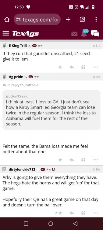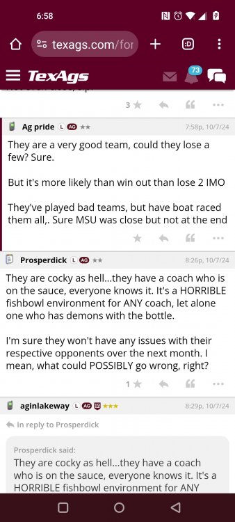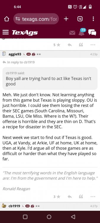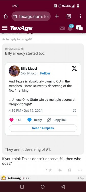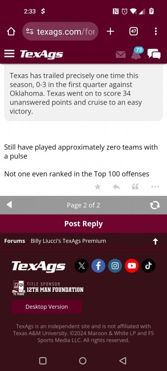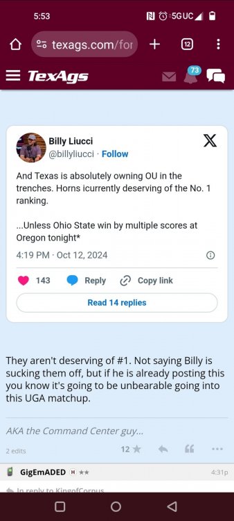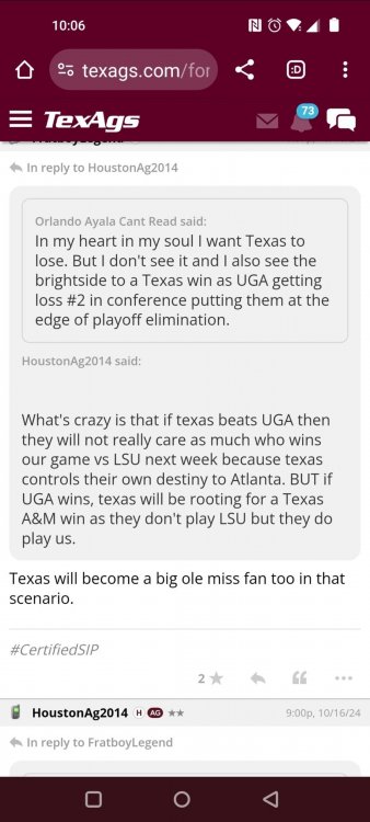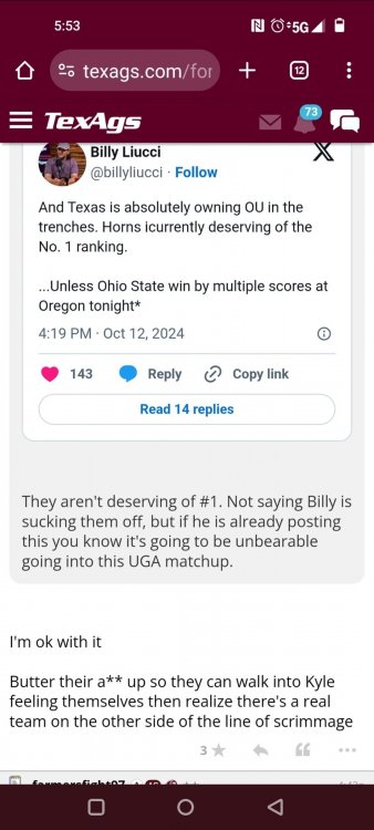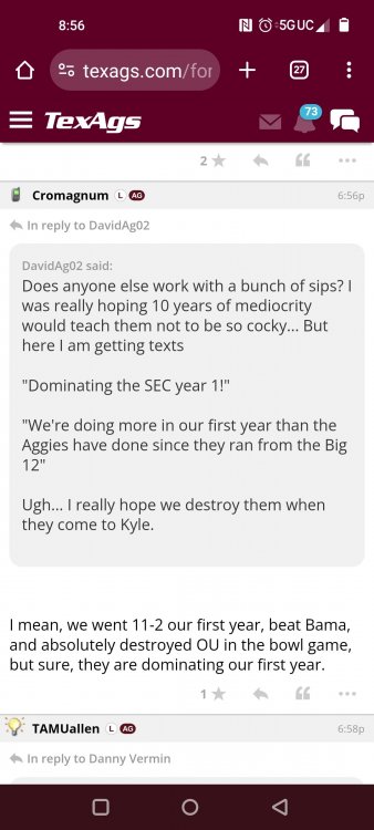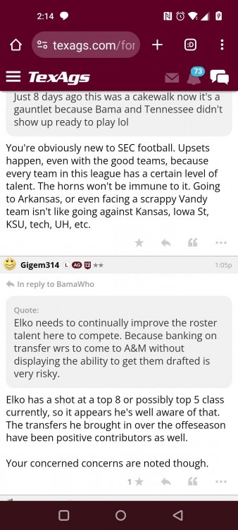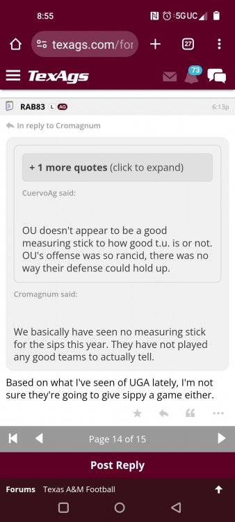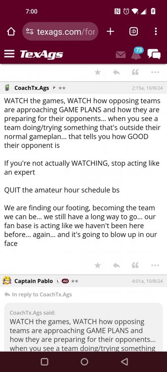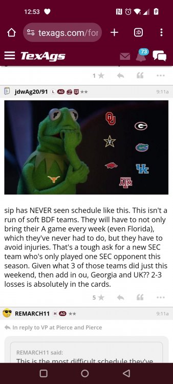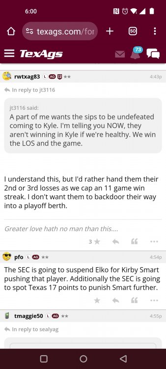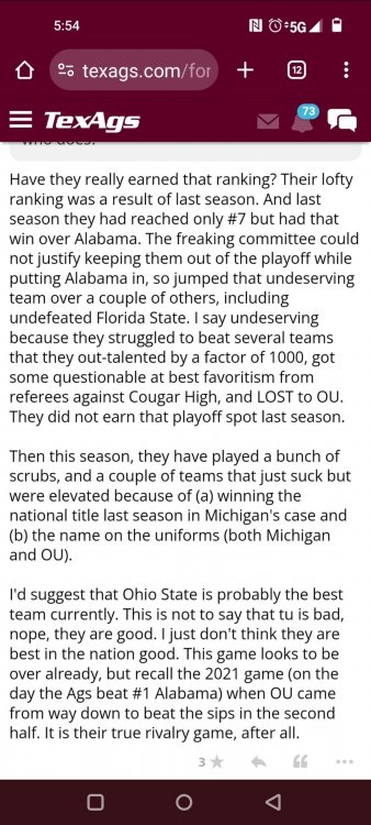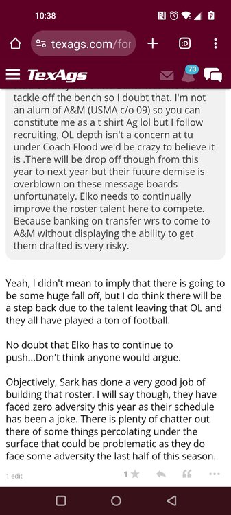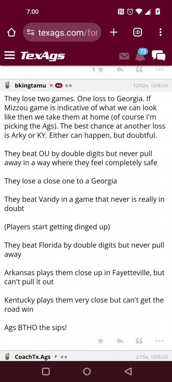 Surprised it has taken him this long to produce the sunshine article By Billy Liucci October 7, 2024 Texas A&M opened the season with a golden opportunity to make a statement in game one of the Mike Elko era. When Notre Dame walked off of Kyle Field the winner after four tough quarters, a large group of frustrated Aggie fans — and most of college football media — immediately wrote off the Aggies in 2024. After just a single game, the general consensus was that A&M would scrap through a “rebuilding” season while Elko established his culture and eventually flipped the roster. It took Elko and the Aggies all of five weeks to flip what was a ridiculously premature narrative (even at the time) on its head. Following the 23-13 loss to the Fighting Irish, it was evident that the Maroon & White needed to make significant and immediate strides on both sides of the ball. If not, forget about down the road showdowns later this fall, A&M getting out of September sans another blemish would have been unlikely. A road trip to “The Swamp” to take on a desperate Florida team followed by a senior-laden MAC contender and then the annual circus vs. Arkansas in Arlington. Mix in the fact that Conner Weigman suffered an injury in the season-opening loss that eventually sidelined him for three games, and it's almost understandable that many without any inside knowledge of Elko, his staff or team would write off the Aggies' chances and shift their focus elsewhere. However, a funny thing happened on the way from Notre Dame to a bye week that rests squarely at the season's midway point. The Aggies quietly came together and got better. Marcel Reed played like a seasoned veteran during his first career start in Gainesville, and a team determined to end a two-plus year road losing streak managed to put Florida and the 90,000 Gator fans in attendance away early. A week later, the Aggies appeared to lose some focus but didn't flinch when staring down what would have been a season-derailing upset, winning the fourth quarter and disposing of Bowling Green. At Jerry World, the Aggies again rose up when the game was on the line, thanks to Le'Veon Moss running hog wild and Jay Bateman's defense smothering Bobby Petrino's Arkansas offense down the stretch. September lessons were learned, and as is always the deciding factor in year one of a head coach's tenure, the A&M players remained engaged and were receptive to Elko's messaging. When the Aggies went on the road and raced out to a 20-0 halftime lead at “The Swamp,” it became very clear that the culture was quickly changing in College Station. The next step, of course, was winning the fourth quarter and closing out tough games. That happened in back-to-back weeks — and against two very different foes — against Bowling Green and Arkansas. The September wins were a great indicator of things like improvement and buy-in. The Aggies began making more big plays than allowing them, the run game showed marked week-to-week improvement, they began protecting the football and began regularly producing momentum- and game-changing plays on defense. The result? College football's only ranked matchup of the weekend, with 4-0 and No. 9 Missouri taking on No. 25 and 4-1 Texas A&M in front of the 12th Man. It goes without saying that Elko and the Aggies took full advantage of the chance to force their way back into the SEC and national conversation, taking Missouri to the woodshed and handing the Tigers the kind of beating that led to A&M making an eye-catching 10-spot rise in the polls. An earlier-than-expected shot at redemption for the Aggies, as A&M got a second shot at a top-25 showdown against a top-10 opponent at home before mid-season. It goes without saying that Elko and the Aggies took full advantage of the chance to force their way back into the SEC and national conversation, taking Missouri to the woodshed and handing the Tigers the kind of beating that led to A&M making an eye-catching 10-spot rise in the polls. The newly-ranked No. 15 Aggies drove 60 yards on eight plays into the end zone on their first possession and had Mizzou in a seemingly insurmountable 24-0 hole at halftime. When Moss took a handoff on the first play of the third quarter, saw a gaping hole and sprinted 75 yards to paydirt, the Ags led a top-10 opponent 31-0, and it sure looked like Eli Drinkwitz's Tigers couldn't get on the plane to Columbia fast enough. For four quarters during a 41-10 trouncing of the Tigers, the Aggies played like a team capable of beating anyone on the remaining schedule. Weigman (yes, the lede has been buried here, but we'll get to #15 in a moment) was absolutely dealing, and the passing game clicked like we haven't seen all season, with his targets catching everything thrown their way. With a physical offensive line paving the way, the running game once again carved up an SEC defense as Moss rumbled his way to 138 yards and three touchdowns on just 12 carries. Defensively, the Aggies held a Mizzou offense loaded with skilled playmakers to a single touchdown and barely 250 total yards. A five-game winning streak, the Aggies' first 3-0 SEC record since 2016 (their second since joining the league) and a top-15 ranking had the national college football voices singing a very different tune about Texas A&M football by Saturday afternoon, as top-10 teams around the country continued dropping like flies. And while field stormings and goalpost takedowns in Nashville and Fayetteville ultimately stole the weekend headlines (deservedly so), the Aggies beating the hell out of Missouri was the top-10 “upset” that didn't feel like one. The Aggies looked like a top-10 outfit on Saturday, while Missouri looked like a fringe top-25 squad. Seemingly out of nowhere, A&M looked elite in all three phases of the game. The ease with which the Ags disposed of a Missouri team that came in 15-2 since the start of last season — combined with what took place around the SEC and colleg