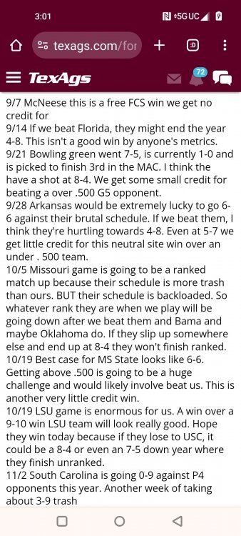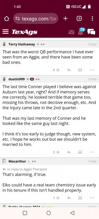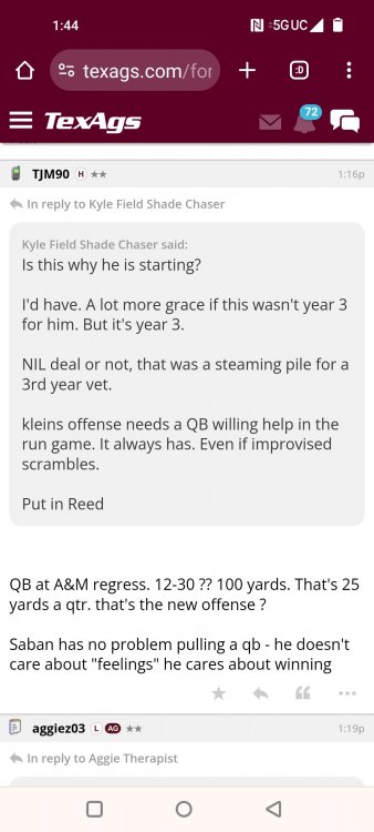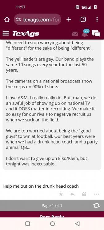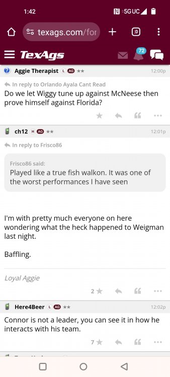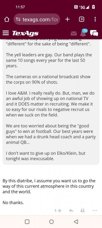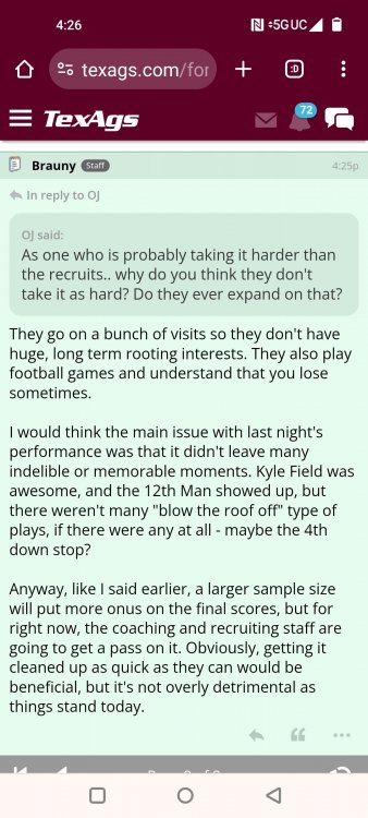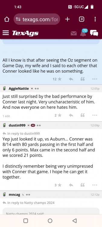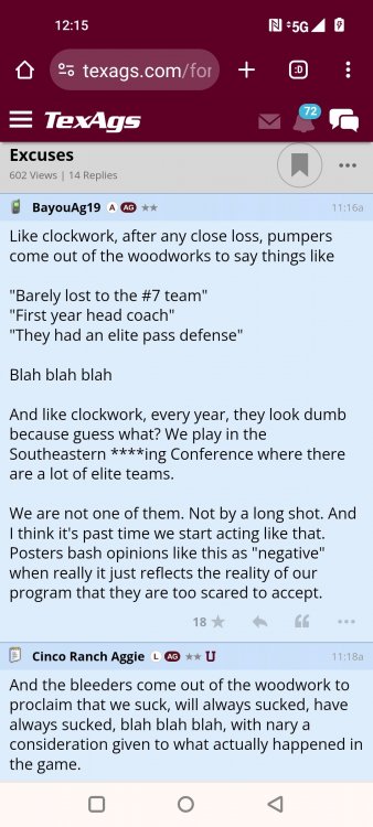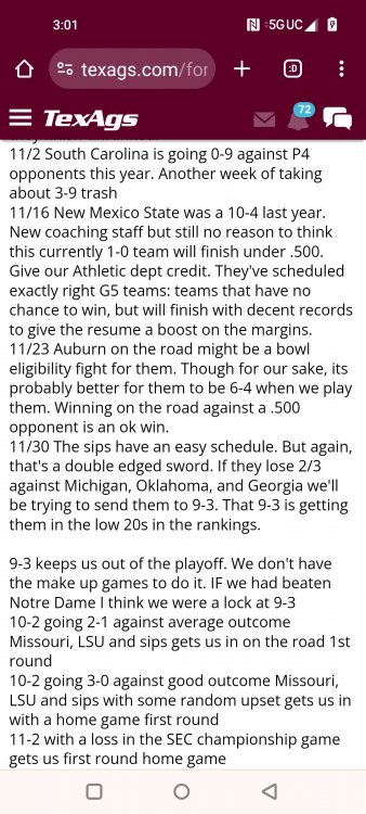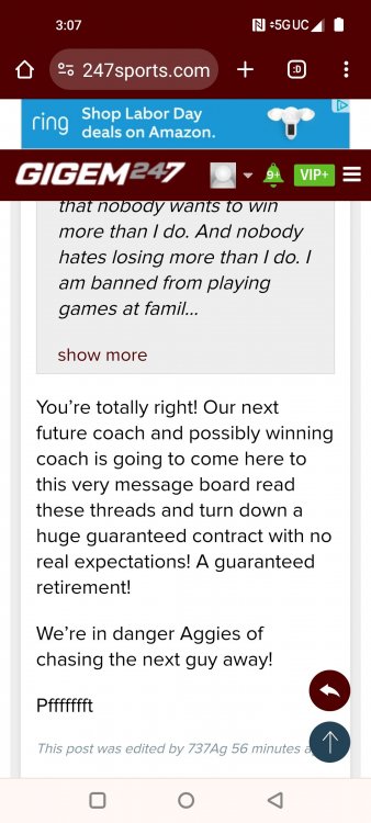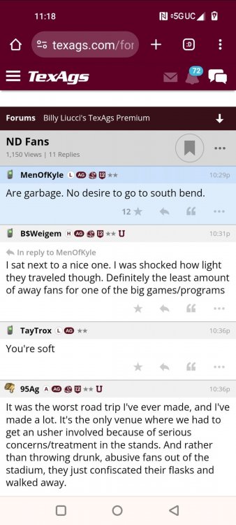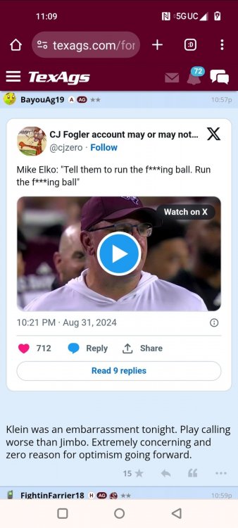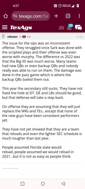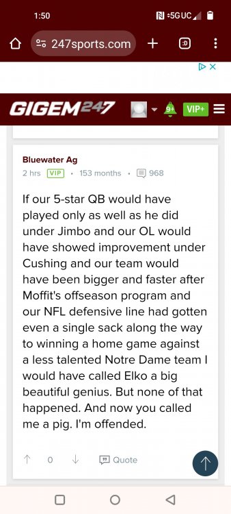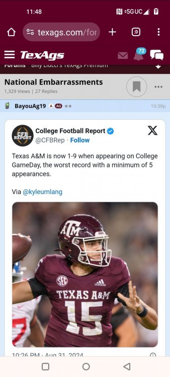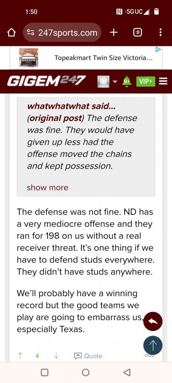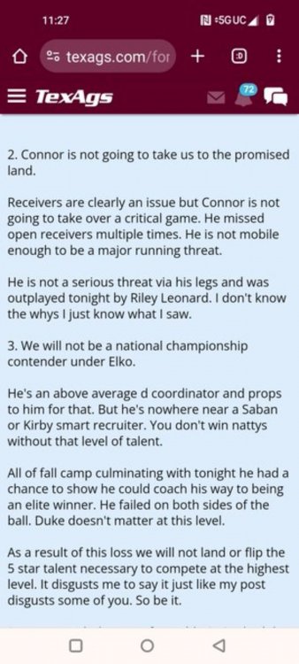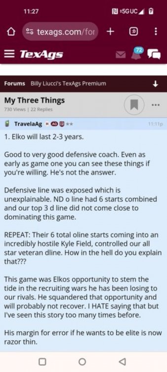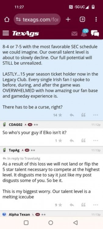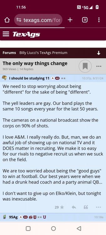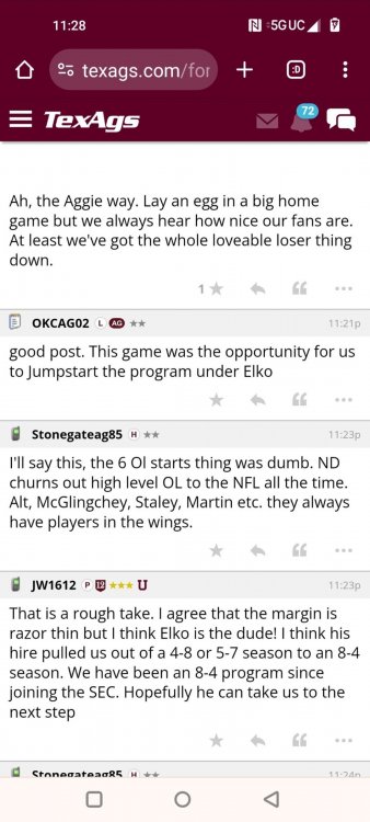 Liucci with a lot of words Saturday's pre-game build-up checked every box imaginable. The 12th Man and the Fighting Irish. The return of “Power.” Johnny f'ing Football and Nick Saban. Sports celebrities dotting the sidelines. Mike Elko leading the Aggies into battle for the first time. With 107k packed into Kyle Field under the glare of the national spotlight, the stage was set for an epic night in College Station. College football, the greatest sport in the country, is the pageantry, the tortuous offseason build-up and the realization that an entire season oftentimes feels like it hinges on a single game. That's what makes opening a season and, in this case, a new coaching tenure, with a premier opponent equal parts special and stressful. On Saturday night, as Notre Dame calmly marched 85 yards down the field for the game-winning touchdown late in the fourth quarter, Aggies and Irish alike felt like the 2024 campaign was hanging in the balance less than sixty minutes into a 12-game season. Unfortunately, the Aggies weren't quite ready for primetime, as Marcus Freeman, Riley Leonard and a terrific Irish defense proved a little too much during a “gut check” closing stretch. That, my friends, is why TexAgs and social media were on fire into the wee hours and why Notre Dame fans are likely breaking down what already looks like a clear path to the new 12-team playoff over Sunday brunch in South Bend. Unfortunately, the Aggies weren't quite ready for primetime, as Marcus Freeman, Riley Leonard and a terrific Irish defense proved a little too much during a “gut check” closing stretch. This should be a tough one for A&M fans — and, more importantly, the coaches and players in Bright — to process on the day after. In talking to folks both last night and already today, the overwhelming sentiment is “same song, different verse” and “here we go again.” Emotionally speaking, I get it. The offense and quarterback struggled to move the ball and produce points, and the Aggies dropped a very winnable big game, failing to capitalize on a golden opportunity. Despite losing the turnover battle 2-0 and not being able to generate anything in the passing game, the A&M defense took the field with 6:23 remaining in the fourth quarter, needing a stop to get the ball back and win the game. When the Ags are that close to securing a top-10 win to open not only the season but the Elko Era and can't get it done, every mistake and shortcoming is magnified, and the frustration is understandably much higher than after a run-of-the-mill A&M loss. We all know what the Ags left on the field last night, and no one understands that as much as the guys in the losing locker room. Had Conner Weigman hit Noah Thomas for a chunk gain past the A&M 40-yard line instead of sailing a throw that was picked off, do the Ags finish that drive out and go up 13-3 instead of watching the Irish tie it at 6-6? The Aggies were also on the move just before the break, but a second drive stalled in Irish territory following Weigman's uncharacteristic second interception. Maria Lysaker-USA TODAY Sports Not entirely impressive, Riley Leonard passed for just 158 yards and no touchdowns. He rushed for 63 yards. And the play of the game may have come when the Ags had the visitors right where they wanted them. With the game tied 13-13, Notre Dame took over deep in their own territory with under seven minutes remaining. A quick stop and the Aggie offense would take over in great field position, needing only a field goal to win it. The Irish were staring at a third-and-5 from their own 20-yard line, backed up in the deafening north end zone. The Ags had the defense on the field, needing a third-down stop (Notre Dame was just 2-for-10 on third downs, mind you) with the game hanging in the balance. It's exactly what Elko and everyone in that stadium wanted. And then Leonard converted, and then he hit Beaux Collins for a 20-yard gain on the visiting sideline. Then a few plays later, Jeremiyah Love burst into the end zone from 18 yards out, and the Aggies went from being in an excellent position to win the game to needing a small miracle. That's how close this one was...but it was also clear that Notre Dame was the better team (albeit very slightly) down the stretch. For the most part, Saturday night’s tug-of-war went pretty much as planned. As August drew to a close, this game had all the makings of a 23-20 or 20-17 type of affair, hence the 2.5-point line and O/U sitting somewhere around 43 points. I don't think Elko or Freeman would have offered much disagreement if you had told them the first one to 20 on Saturday would win. With the strength of both teams weighted heavily towards defense, a new OC on each sideline, one quarterback coming back from a season-ending injury and the other playing his first game in a new program, a 13-13 game in the fourth quarter could have been predicted. What wasn't expected is what has many wringing their hands while taking a peek at the SEC schedule. Weigman went just 12-for-30 for a mere 100 yards and two interceptions without a touchdown. The junior gunslinger was inaccurate down the field and looked very flustered by Freeman's man-heavy defense. In addition to turning the ball over, Weigman had a chance to shake off a bad night by leading the Ags down the field to tie the score in the final minutes. Instead, he threw three incompletions on four downs as Notre Dame sealed the win. That's not the Weigman we expected to see in 2024, nor is it the quarterback so many NFL scouts believed they'd seen on tape. Maria Lysaker-USA TODAY Sports According to Pro Football Focus, Conner Weigman’s passing grade vs. Notre Dame was a lackluster 28.0. Defensively, the Aggie defensive line played well for most of the game, but some long runs and Leonard knifing through creases on key downs resulted in nearly 200 rushing yards allowed. Irish offensive coordinator Mike Denbrock also called a good game and kept 