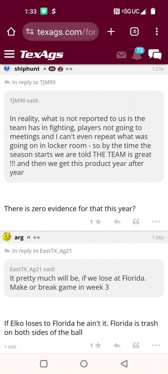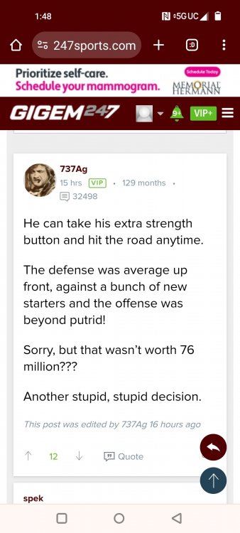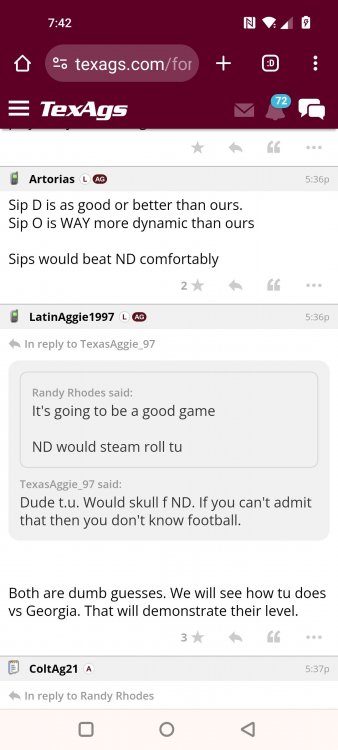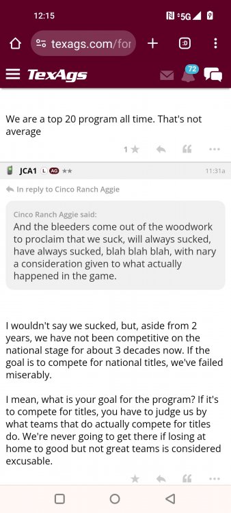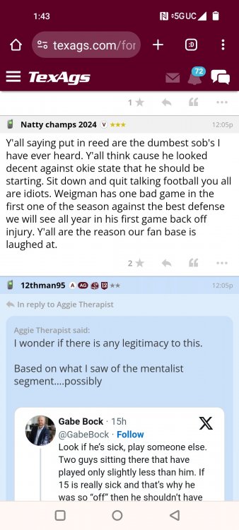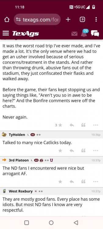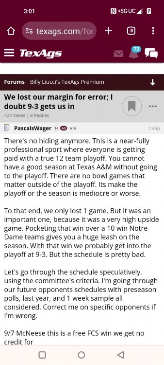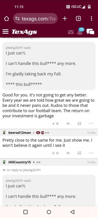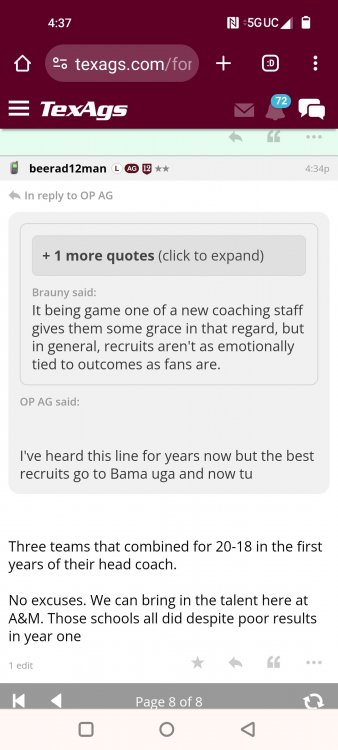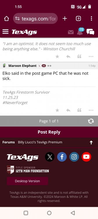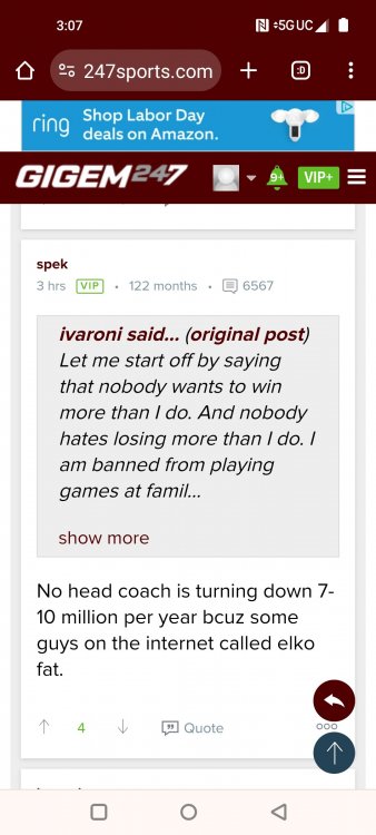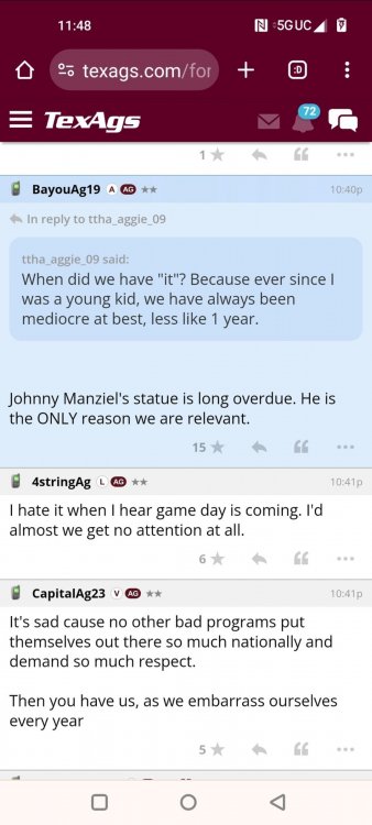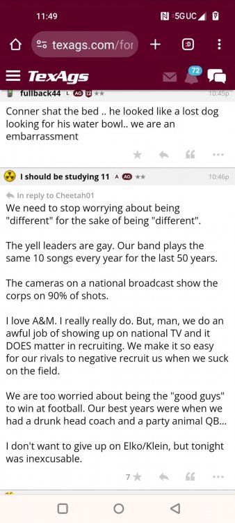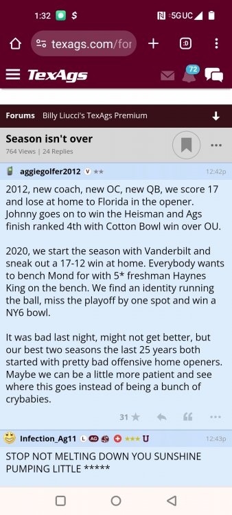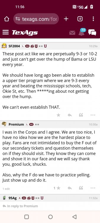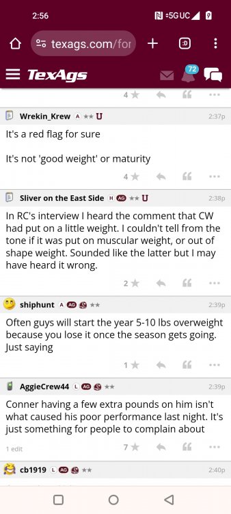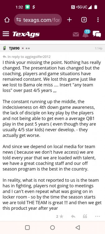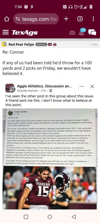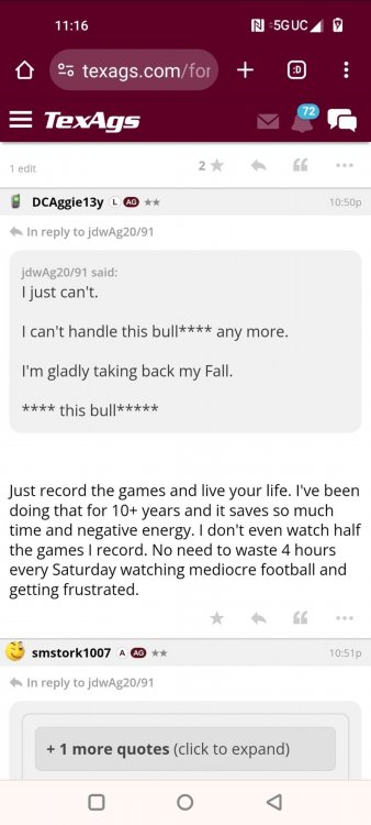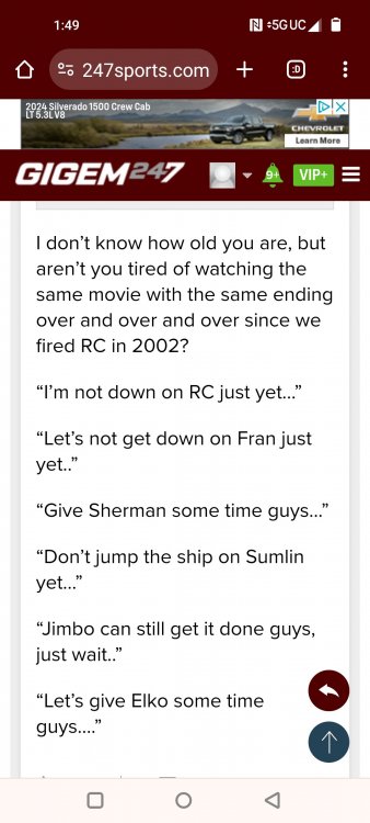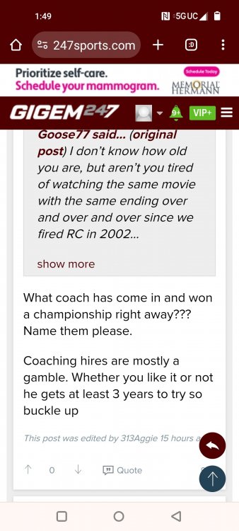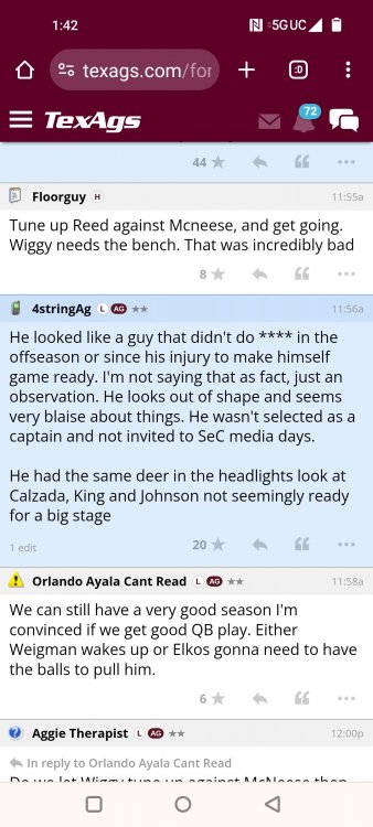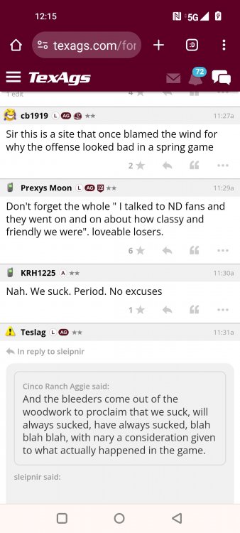 Liucci with a lot of words Saturday's pre-game build-up checked every box imaginable. The 12th Man and the Fighting Irish. The return of “Power.” Johnny f'ing Football and Nick Saban. Sports celebrities dotting the sidelines. Mike Elko leading the Aggies into battle for the first time. With 107k packed into Kyle Field under the glare of the national spotlight, the stage was set for an epic night in College Station. College football, the greatest sport in the country, is the pageantry, the tortuous offseason build-up and the realization that an entire season oftentimes feels like it hinges on a single game. That's what makes opening a season and, in this case, a new coaching tenure, with a premier opponent equal parts special and stressful. On Saturday night, as Notre Dame calmly marched 85 yards down the field for the game-winning touchdown late in the fourth quarter, Aggies and Irish alike felt like the 2024 campaign was hanging in the balance less than sixty minutes into a 12-game season. Unfortunately, the Aggies weren't quite ready for primetime, as Marcus Freeman, Riley Leonard and a terrific Irish defense proved a little too much during a “gut check” closing stretch. That, my friends, is why TexAgs and social media were on fire into the wee hours and why Notre Dame fans are likely breaking down what already looks like a clear path to the new 12-team playoff over Sunday brunch in South Bend. Unfortunately, the Aggies weren't quite ready for primetime, as Marcus Freeman, Riley Leonard and a terrific Irish defense proved a little too much during a “gut check” closing stretch. This should be a tough one for A&M fans — and, more importantly, the coaches and players in Bright — to process on the day after. In talking to folks both last night and already today, the overwhelming sentiment is “same song, different verse” and “here we go again.” Emotionally speaking, I get it. The offense and quarterback struggled to move the ball and produce points, and the Aggies dropped a very winnable big game, failing to capitalize on a golden opportunity. Despite losing the turnover battle 2-0 and not being able to generate anything in the passing game, the A&M defense took the field with 6:23 remaining in the fourth quarter, needing a stop to get the ball back and win the game. When the Ags are that close to securing a top-10 win to open not only the season but the Elko Era and can't get it done, every mistake and shortcoming is magnified, and the frustration is understandably much higher than after a run-of-the-mill A&M loss. We all know what the Ags left on the field last night, and no one understands that as much as the guys in the losing locker room. Had Conner Weigman hit Noah Thomas for a chunk gain past the A&M 40-yard line instead of sailing a throw that was picked off, do the Ags finish that drive out and go up 13-3 instead of watching the Irish tie it at 6-6? The Aggies were also on the move just before the break, but a second drive stalled in Irish territory following Weigman's uncharacteristic second interception. Maria Lysaker-USA TODAY Sports Not entirely impressive, Riley Leonard passed for just 158 yards and no touchdowns. He rushed for 63 yards. And the play of the game may have come when the Ags had the visitors right where they wanted them. With the game tied 13-13, Notre Dame took over deep in their own territory with under seven minutes remaining. A quick stop and the Aggie offense would take over in great field position, needing only a field goal to win it. The Irish were staring at a third-and-5 from their own 20-yard line, backed up in the deafening north end zone. The Ags had the defense on the field, needing a third-down stop (Notre Dame was just 2-for-10 on third downs, mind you) with the game hanging in the balance. It's exactly what Elko and everyone in that stadium wanted. And then Leonard converted, and then he hit Beaux Collins for a 20-yard gain on the visiting sideline. Then a few plays later, Jeremiyah Love burst into the end zone from 18 yards out, and the Aggies went from being in an excellent position to win the game to needing a small miracle. That's how close this one was...but it was also clear that Notre Dame was the better team (albeit very slightly) down the stretch. For the most part, Saturday night’s tug-of-war went pretty much as planned. As August drew to a close, this game had all the makings of a 23-20 or 20-17 type of affair, hence the 2.5-point line and O/U sitting somewhere around 43 points. I don't think Elko or Freeman would have offered much disagreement if you had told them the first one to 20 on Saturday would win. With the strength of both teams weighted heavily towards defense, a new OC on each sideline, one quarterback coming back from a season-ending injury and the other playing his first game in a new program, a 13-13 game in the fourth quarter could have been predicted. What wasn't expected is what has many wringing their hands while taking a peek at the SEC schedule. Weigman went just 12-for-30 for a mere 100 yards and two interceptions without a touchdown. The junior gunslinger was inaccurate down the field and looked very flustered by Freeman's man-heavy defense. In addition to turning the ball over, Weigman had a chance to shake off a bad night by leading the Ags down the field to tie the score in the final minutes. Instead, he threw three incompletions on four downs as Notre Dame sealed the win. That's not the Weigman we expected to see in 2024, nor is it the quarterback so many NFL scouts believed they'd seen on tape. Maria Lysaker-USA TODAY Sports According to Pro Football Focus, Conner Weigman’s passing grade vs. Notre Dame was a lackluster 28.0. Defensively, the Aggie defensive line played well for most of the game, but some long runs and Leonard knifing through creases on key downs resulted in nearly 200 rushing yards allowed. Irish offensive coordinator Mike Denbrock also called a good game and kept 