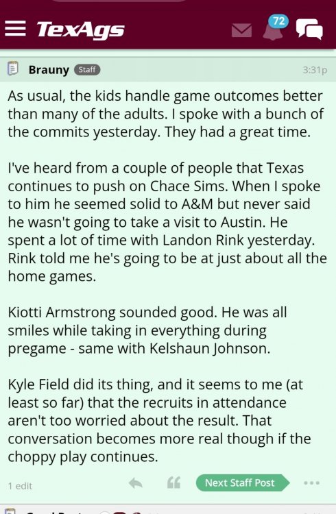 Visitor List: Texas A&M vs Notre Dame 749 Views | 18 Replies Staff Only ... Brauny Staff Well, we usually wait to post these on Wednesdays, but here we go. This thing is a doozy, and it absolutely would not surprise us if some more names are added between now and Saturday morning. On the flip side, some kids on this list will not show. As always, we will do our best to provide updates throughout the remainder of the week. Texas A&M Commits 2024 Greyshirt TE Eric Karner, Elmhurst (IL) Immaculate Conception QB Husan Longstreet, Corona (CA) Centennial ATH Kiotti Armstrong, Jasper (TX) WR Tristan Norman, Montgomery (AL) Carver WR Kelshaun Johnson, Hitchcock (TX) OL Connor Carty, Prosper (TX) OL Tyler Thomas, Dickinson (TX) OL Marcus Garcia, Denton (TX) Ryan OL Jonte Newman, Cypress (TX) Bridgeland OL Josh Moses, Houston (TX) Legacy DL Landon Rink, Cypress (TX) Cy-Fair DL Chace Sims, Richmond (TX) Randle OLB Marco Jones, Danville (CA) San Ramon Valley LB Noah Mikhail, La Verne (CA) Bonita LB Kelvion Riggins, Forney (TX) DB Deyjhon Pettaway, Katy (TX) Paetow DB Cobey Sellers, Alvin (TX) Shadow Creek DB Adonyss Currie, Quartz Hill (CA) DB Jamar Beal-Goines, Goodyear (AZ) Desert Edge PWO K Colton Chmelar, College Station (TX) A&M Consolidated PWO DS Gray Evans, Houston (TX) Bellaire Episcopal 2026 DB Markel Ford, Mesquite (TX) Horn 2026 DB Ryan Gilbert, Forney (TX) North Forney 2025 Prospects ATH Daylion Robinson, Willis (TX) RB Titus Muse, Dallas (TX) Dallas Christian TE Vander Ploog, Fullerton (CA) Troy WR Jerome Myles, Draper (UT) Corner Canyon LB Joseph Sutton, Cypress (TX) Cy-Fair 2026 Prospects QB Helaman Casuga, Draper (UT) Corner Canyon QB Rees Wise, Austin (TX) Westlake ATH Jermaine Bishop, Willis (TX) RB Javian Osborne, Forney (TX) RB Keilan Chavies, Hutto (TX) RB Amante Martin, Port Arthur (TX) Memorial RB Tradarian Ball, Texarkana (TX) Texas RB Raycine Guillory Jr., Aledo (TX) RB Cardae Mack, Humble (TX) Atascocita RB Trey Mosley, Brownwood (TX) OL Nicolas Robertson, Klein (TX) OL Vincent Johnson, Sulphur Springs (TX) OL Avery Morcho, Missouri City (TX) Ft Bend Ridge Point OL Drew Evers, Flower Mound (TX) OL Pupungatoa Katoa, Euless (TX) Trinity OL Samuelu Utu, Orange (CA) Lutheran OL Zaden Krempin, Prosper (TX) OL Bryce Gilmore, Prosper (TX) OL Felix Ojo, Mansfield (TX) Lake Ridge TE Matt Ludwig, Billings (MT) West TE Cooper McCutchan, Cincinnati (OH) Archbishop Moeller TE Evan Jacobson, Waukee (IA) WR Connor Salmin, Purcellville (VA) Woodgrove WR Mike Brown, Houston (TX) Legacy WR Brayden Robinson, Red Oak (TX) WR Chris Stewart, Alvin (TX) Shadow Creek WR Dominic Saidu-Robinson, Frisco (TX) Rock Hill WR Jordan Clay, San Antonio (TX) Madison WR Davian Groce, Frisco (TX) Lone Star WR Mason James, Norman (OK) North WR Brandon Arrington, Spring Valley (CA) Mount Miguel WR Jalen Lott, Frisco (TX) Panther Creek WR London Smith, Waco (TX) University WR Kaydon Finley, Aledo (TX) WR Jabari Mack, Destrehan (LA) WR Dequane Prevo, Texarkana (TX) Liberty-Eylau DS Will Terry, Iowa Colony (TX) DL Braeden Jones, Chicago (IL) Mount Carmel DL Dylan Berymon, Monroe (LA) Ouachita Parish DL Jimmy-Phrisco Alo-Suliafu, Katy (TX) Jordan DL Tiki Hola, Bastrop (TX) DL Jamarion Carlton, Temple (TX) DL Anthony Jones, Mobile (AL) St Paul's DL Jermaine Kinsler, Oradell (NJ) Bergen Catholic DL Jesse Ford, Arlingotn (TX) Martin DL Blaze Jones, Orlando (FL) The First Academy DL Prince Williams, Las Vegas (NV) Bishop Gorman LB Tank King, Port Arthur (TX) Memorial LB DaQuives Beck, Carthage (TX) LB Noriel Dominguez, Richmond (TX) Randle LB Kosi Okpala, Katy (TX) Mayde Creek LB Jamarion Phillips, Dallas (TX) South Oak Cliff DB Xavier Harmon, Conroe (TX) DB Chaston Smith, Chattanooga (TN) McCallie School DB Jordan Thomas, Oradell (NJ) Bergen Catholic DB Brock King, Port Arthur (TX) Memorial DB Chace Calicut, Houston (TX) North Shore DB Jermaine Santana-Diaz, Missouri City (TX) Ft Bend Ridge Point DB Donovan Webb, Frisco (TX) Panther Creek DB Jordan Deck, Frisco (TX) Lone Star DB Jordan Davis, Dallas (TX) HSAA DB Braylon Edwards, Duncanville (TX) DB Bralan Womack, Flowood (MS) Hartfield Academy DB Brandon Ford, Crowley (TX) 2027 Prospects QB Weston Nielsen, Bastrop (TX) QB Luke Babin, Woodville (TX) QB Key'Tavien Williams, Katy (TX) Paetow QB Carson White, Iowa Colony (TX) RB Jakoby Dixon, Brenham (TX) RB D'Adrian Renfro, San Augustine (TX) RB Wayne Shanks Jr, Houston (TX) Kinkaid RB Lathan Whisenton, Waco (TX) Midway RB Landen Williams-Callis, Richmond (TX) Randle OL Brian Swanson, Dallas (TX) South Oak Cliff OL Peyton Miller, Anna (TX) OL Qua Ford, Texarkana (TX) Texas OL Zander Krempin, Prosper (TX) OL Jasper Ngokwere, Richardson (TX) TE Hudson Ploog, Fullerton (CA) Troy WR Antayvious Ellis, Crowley (TX) WR Aden Starling, Iowa Colony (TX) WR Darrod Jacobs, Port Arthur (TX) Memorial WR Julian Caldwell, Argyle (TX) WR Tre Moore, Pflugerville (TX) Weiss WR Trenton Yancey, Duncanville (TX) DL Johnnie Fitzgerald, Red Oak (TX) DL Ezekiel Ayangbile, Houston (TX) Langham Creek DL Xavier Muhammad, Houston (TX) South Houston DL Khyren Haywood, Denton (TX) Guyer DB Hakim Frampton, Harbor City (CA) Narbonne DB Davontrae Kirkland, Waco (TX) University DB Taelyn Mayo, Lewisville (TX) DB Dhillon McGee, Red Oak (TX) DB Montre Jackson, Garland (TX) Lakeview Centennial DB JayQuan Snell, Waxahachie (TX) DB Cooper Witten, Argyle (TX) Liberty Christian DB Duvay Williams, Gardena (CA) Junipero Serra 2028 Prospects RB Micah Rhodes, Spring (TX) Klein Oak WR Terrell Stinson, Houston (TX) Clear Lake LB Brayden Bonik, Missouri City (TX) Ft Bend Ridge Point -