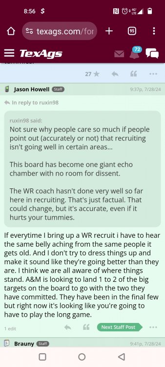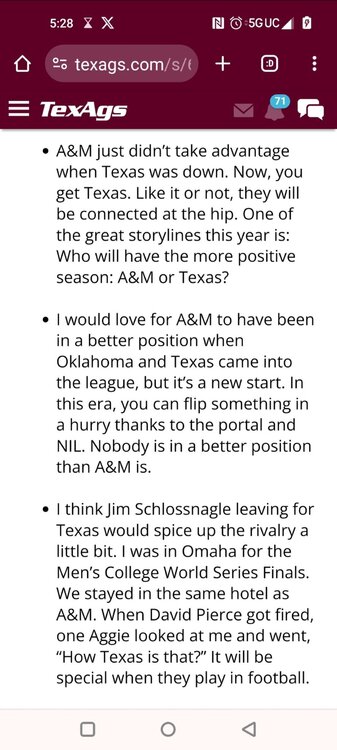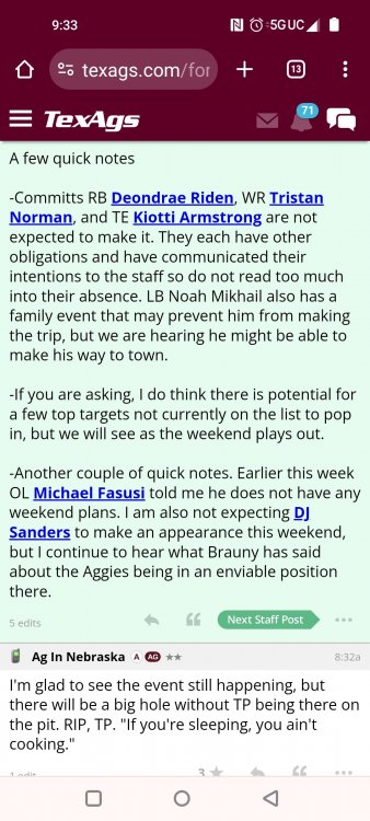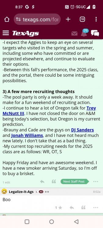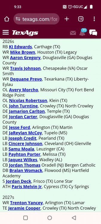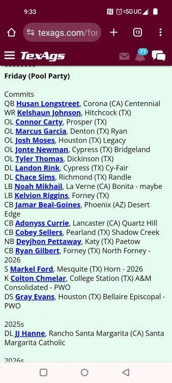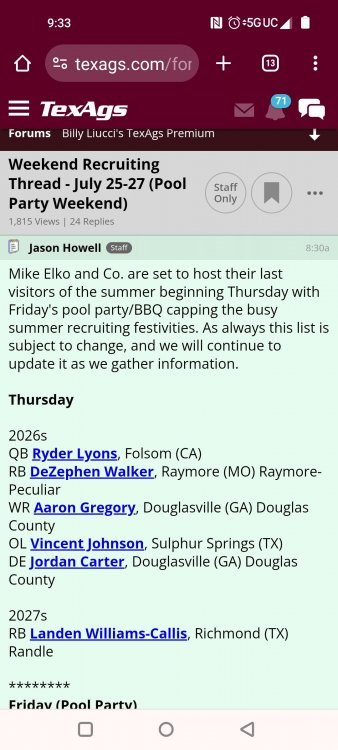 Fat Hamm with word salad TexAgs' recruiting analyst Ryan Brauninger joined TexAgs Radio on Wednesday morning for another edition of Recruiting Country, highlighting the latest news and notes from the recruiting trail surrounding Texas A&M. Key notes from Recruiting Country Everything that Mike Elko has done has been almost 180 degrees different than the way things were happening a year ago. When the pool party looks different than it has in the past, everybody in the fanbase, up to this point, has been on board with these changes. What Mike Elko said yesterday about nobody having missed a workout last summer when last year we had guys missing multiple workouts a week. All of that has changed. When they have a different feel for the way they want to run these recruiting events, shouldn’t this guy get the benefit of the doubt? Everything he does has been done with a purpose. To me, I’m confident that whatever Mike Elko does. There is a real thought process, strategy and reasoning for it. In a month, you are going to host a massive home game in front of the national audience, and that is going to portray what Texas A&M is better than a late-July pool party with nobody on campus. It would be great if they went out and got Trey McNutt III, Jonah Williams and Kaliq Lockett, but if they don’t, just stick with Mike Elko. There is a method to what he is doing. He has a lot of his class done, and a lot of the work is already done. I think this party was more of a jump start for the class of 2026 rather than creating more momentum for the class of 2025. Noah Mikhail and a bunch of the California guys were able to come. I believe there were only two from in-state that didn’t make it. Deondrae Riden had a test to graduate early, and Tyler Thomas at Dickinson had it hard due to all the rain. This was the first time that this mass group of commitments was all together in one place. It was about making a bond. The group chat got so much better, I bet. Getting them together was the important thing here. To learn to be tight-knit and loyal to each other so in a month, you have those guys coming in with that bond formed already. Texas A&M’s best selling point in the fall is what Saturdays look like in Kyle Field. To open this season with a marquee matchup, they’re going to take every advantage. From what we are hearing right now, that guest list is going to be star-studded. There are going to be some elite players from the class of 2025 and 2026 on campus. Trey McNutt is the big one. He came in the day before the pool party and went to Oregon for an unofficial visit. A&M did a fantastic job. They had a very personable and personalized visit. There were a lot of one-on-one talks about how Texas A&M would serve Trey McNutt and vice versa. The Aggies did a really good job heading into that Oregon visit. It was massively important that he moved his commitment date back. I truly believe that it is a coin flip. This is a kid that, if A&M lands him, will be Mike Elko’s best recruiting job. When a kid gets set in his mind that he is favoring one place, it is hard enough to break into that line of thinking, much less to surpass it. It is hard enough to find a crack in the door to get in. If A&M wins out, not only have they come from behind, but they have completely changed this kid’s mind on what his future is going to look like. From what I’ve heard, I think his family is very comfortable with him playing football in the state of Texas. Trey McNutt has been in Houston a lot this summer training. That could play a factor in this thing. I’m not sitting here saying who is going to win, I am just giving you the reasons why it could be Texas A&M. Jonah Williams’ decision is going to be 99.99 percent a football decision because of what has happened to the baseball rosters. You only get 34 players. Jonah is a legitimate dual-sport athlete. I think he is a professional baseball prospect, but he is also an NFL player. He is a rare breed of athlete. For Texas A&M, they have always been in it. They have been kind of under the radar. It goes to what Mike Elko was talking about at SEC Media Days. All the work is being done behind the scenes. I feel the same way about Michael Fasusi. I have a feeling that Texas A&M is closer to those guys than people are saying. Do not throw your toys out of the bin if Texas A&M doesn’t land any of those guys. There is so much time now. Talent acquisition and roster management is almost a year-round thing. The Aggies could start a linebacker that didn’t even play spring ball in Solomon DeShields. A&M will be able, under this coaching staff, to put a plan in place if you don’t land your big high school guy. Obviously, that is the priority, but if we don’t, there is a plan to mitigate that. People freaked out about some Snapchat Kiotti Armstrong posted from his Texas visit. He was wearing A&M stuff the same day. Kiotti is fine with Texas A&M. I have heard nothing else -