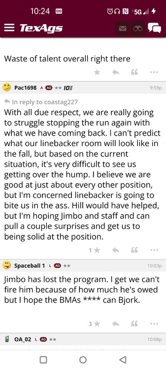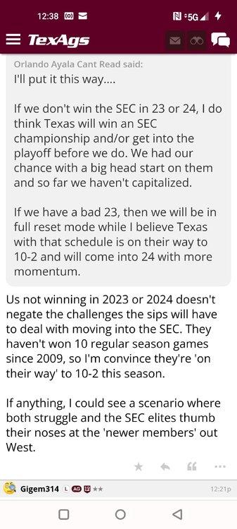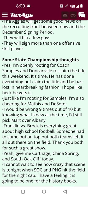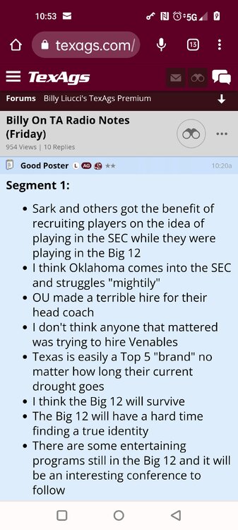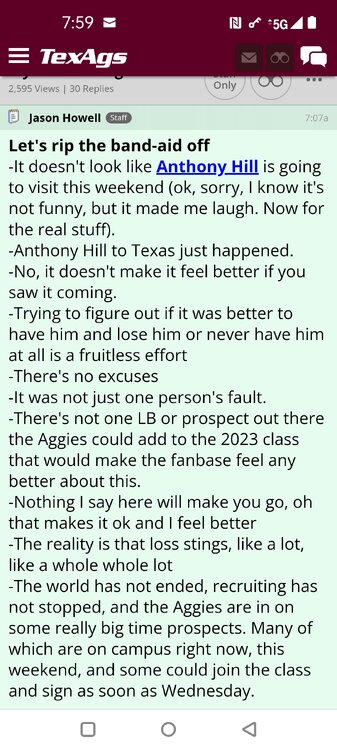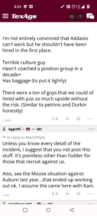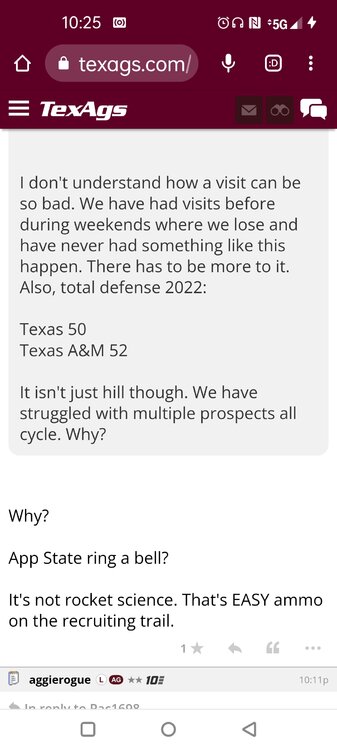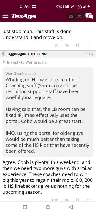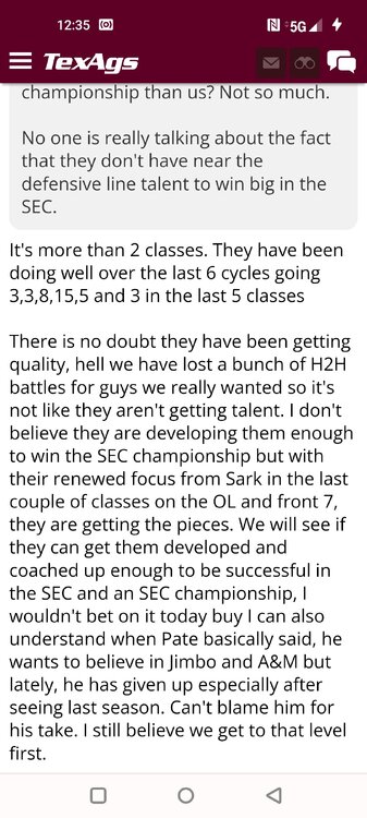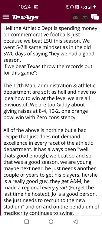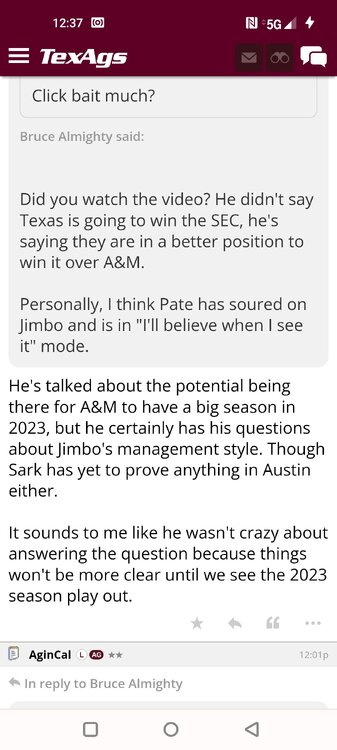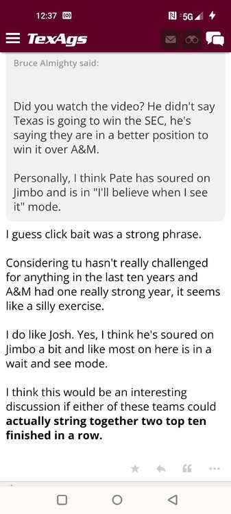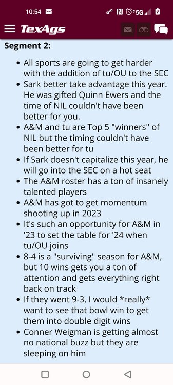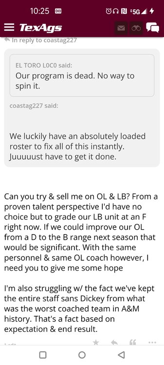ForumsBilly Liucci's TexAgs Premium Quick OC note (Petrino-related) 2,113 Views | 35 Replies Staff Only ... Liucci Staff So here's where things stand as of today: As you all saw this morning, Bobby Petrino has accepted a spot on Barry Odom's UNLV staff in the OC role. He was ready to make the jump back out of FCS ball and waited to see what A&M and a couple of other SEC programs would do as long as he could. However, I'm here to tell you that if the Ags or another name program in the conference decided Petrino was the guy, Odom and the Rebels would have a very hard time keeping him in Vegas. That's just the way of the world when it comes to the college football hierarchy. So what I'm saying is I wouldn't completely rule this one out, though it's far less likely than it was. Even then, of course, Petrino was A candidate and not THE candidate, which I said several times last week though those railing against the 'hire' were more interesting in going apoplectic on the boards and social media. I said last week that the Ags were actively engaged with two other candidates, as well. Those two are still very much in play and are guys I believe Jimbo Fisher could have as soon as he decides to go. However, I think we all understand there's a reason why neither those guys nor Petrino have gotten the call just yet. Why do I say that? Because the Ags aren't sitting around waiting until after the bowl games are played and it's my understanding that the aim is to have this thing wrapped up either before or shortly after next week's Early Signing Day. If one of the guys were leaping off of the page above the others, I think we'd be talking about the next Aggie play-caller by now. Now, there are a few of you who won't let it go and feel the need to hold whatever I say against me despite the fact that what I'm saying is accurate and you're just railing to rail about something so let me be as clear as I can: Having someone hired by Signing Day (a week or so from now) is the 'aim.' It's a moving target and if Fisher decides to wait things out in search of a better fit or more qualified or celebrated candidate, then that's what he'll do. We've seen Jimbo do it before and, once we pass NSD, the pressure to get something done in an instant is essentially behind us. With that said, word I received today is that the goal is to wrap this thing up before the holidays and not after and the three names I was told are still out there. Despite today's Petrino news, the Ags are sitting on the same three candidates they were several days ago but my personal opinion is that the head coach is still looking for the perfect fit. A couple of other things to help provide some clarity: -Don't waste your time tracking flights. Some of you are just stirring up false hope or random candidates because - in 2022 - Fisher and the Ags aren't flying guys to College Station to risk outing candidates when you can simply get things done via zoom. Believe me or not, I'm simply here trying to save you guys some time and mental energy. -There are candidates who were under consideration that Fisher could have had and locked but the Ags chose not to go that particular route. We'll see if the Aggies end up in a better situation or not but that list has included the likes of Phil Longo (Wisconsin), Petrino (UNLV) and recent South Carolina hire Dowell Loggins. At least one other sitting SEC OC has made it clear he'd love the job but Fisher and the Ags decided against adding him to the interview list. In a perfect world, I believe we'd be talking about either Garrett Riley or Dan Mullen as the Aggie OC today and I've been pretty clear why neither of those things happened. Beyond that, much of the hand-wringing you're seeing here hasn't been shared across the street at Bright. Doesn't change the fact that Fisher has to get this one right, however. And so we wait a little longer and reserve judgement