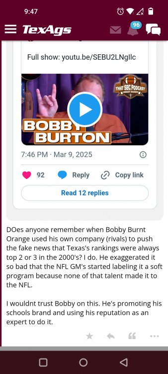 1. Billy!! Now that Oklahoma and Texas are in the SEC, I want the SEC to be the best conference in every sport. Things like the playoff berths, those final spots in the field and the benefit of seeding, I want the SEC to be thought of as the best conference. I no longer care how any of them fare in the postseason for that carryover effect. The SEC is going to be fine in baseball forever. I think it's going to be the SEC and the Big Ten for perpetuity in football. In basketball, as long as they have the caliber of coaching they have now, and NIL is where it's at, and with conference realignment, I don't think they'll typically get as many in the NCAA Tournament as they did this year. For me, as an Aggie, it was way less about SEC pride. I want the SEC to dominate the bowl games. I want them to dominate the non-conference matchups in the regular season. I want them to be lightyears ahead of the Big 12 in baseball so that when it comes down to whether or not Texas A&M or Texas were going to host a super regional, playing in that league would give them that little bit of extra in terms of perception. Being in the SEC was a massive recruiting advantage over Texas and Oklahoma. Did Texas A&M capitalize on that advantage? No. Clearly, they did not. It is an awful failure that in that amount of time when Texas was going through the end of Mack Brown, Charlie Strong and Tom Herman, and the first couple of years of Steve Sarkisian, which were not good. Texas went 5-7 with a six-game losing streak, and then I think they went 7-6 in Sarkisian’s first two years. A couple of years of Sarkisian, a whole tenure of Herman, a whole tenure of Strong and the last couple of years of Mack, and the Aggies couldn't capitalize. A&M was in the SEC in 2012. They couldn't build on it in 2013. Once or twice, they had a chance to be special. Texas is your arch-rival in recruiting. Always has been. Always will be. They were down, and you were almost over the mountain top after that first year in the conference. The beatdown you put on Bob Stoops and Oklahoma. We could talk all day about how close they were and why they didn't get there. With Kyler Murray and all these different things right up until what you thought Conner Weigman could be. You hired Jimbo Fisher and went all in. It felt like he almost got it there. A&M finished No. 4 in the country and followed that up with the No. 1 class of all time. Fisher was almost there. Kevin Sumlin was almost there. They couldn't follow up the great year with another great one. They were both 8-4, but Fisher's felt closer because you had that win over Alabama, and then you beat Auburn. The point is you couldn't capitalize, and now here we are. You had your foot on the neck of your biggest rival. You had a massive advantage in terms of recruiting. It played out that way, but you couldn't capitalize on it, and that's killer. It was a missed opportunity. You can't do anything about that now. You can just go forward with it. When you look at Georgia, Texas and Ole Miss and what they lost, it's fair to ask how do they replace that and still go forward? Texas with Arch Manning, everyone in Austin is going to tell me, "He promised to stay four years." I don't know about that. I know he'll make enough money, but if he has the year you think he's going to have, he's going to be the No. 1 pick in the NFL Draft. Money is not the deal for him or that family, is what I've been told. If they have him for maybe one year, they want Longhorn football to take a step forward. That step forward means winning the SEC and playing for a national title. That's it. Anything else is a big step back. If you go 9-3, it's a big step back. If you go 10-2, don't play in Atlanta and lose the first round of the playoffs, that's a big step back. A&M's step forward has to be 9-3. Play truly meaningful games in November. We got away from realizing it was year one because of how good they started. They lost in the final two minutes to a team that played for the national title. You played the national title game loser to the last two minutes. Nobody wants an award for that, but that was your only loss in the first eight games. SEC Mike texted me, and he had Bobby Burton on. He asked him, "How much money did Texas spend on its football roster last season?" Bobby was quoted by SEC Mike as saying, "A lot. Definitely north of $25 million." We've heard the same thing about Ohio State. I'll be safe and say A&M was operating at probably $10 million-ish below those teams. You know we can throw Oregon in there. I'm sure a lot of teams would have loved to be operating where A&M was last year. Most of college football would love to be there. This year, a lot more will be there because of this athletic department having the house settlement, which will force the athletic departments to pay. If you can do the collective and that thing, a lot of these schools are going to jump up even further. Regardless of that gap, A&M is between that five and 10 range in terms of the amount on the roster. North of $25 million has to be eye-opening. There is nothing wrong with it. When I am ranking coaches, and I don't have Steve Sarkisian, he's just on the fringe of the top five. Everyone tells me Ryan Day is not a good coach. He's got the best roster money can buy. So does Texas. So does Oregon. Texas A&M is trying to, and they have one of the best. You still have to hit on your evaluations, and you still have to develop. Sarkisian can go 5-7, and go sign guys like Quinn Ewers, CJ Baxter, Kelvin Banks Jr. and all of these NFL guys because you had the level of unlimited checkbook that no one else had. That's legal. You're not doing anything wrong, but I don't think he does any of this without having the best roster money can buy. If you don't think Elko is actively trying to get the best roster money can buy, it's not an insult. It's a reality. I think Elko and the group right now have done a tremendous job of taking NIL from here to here