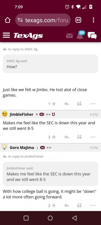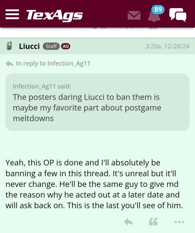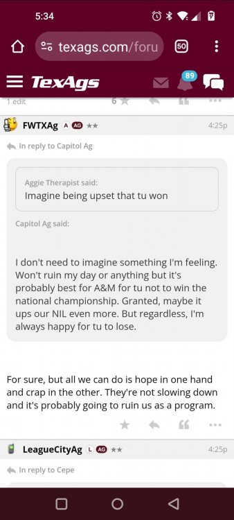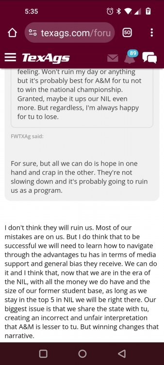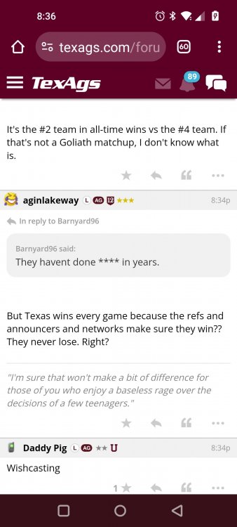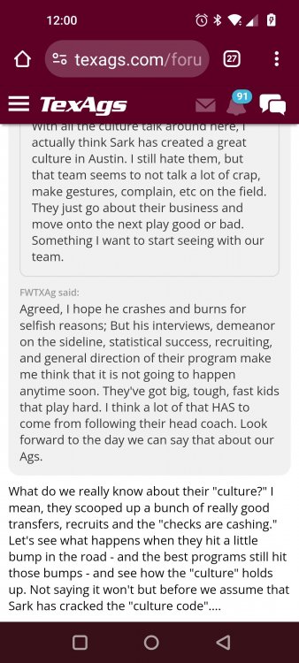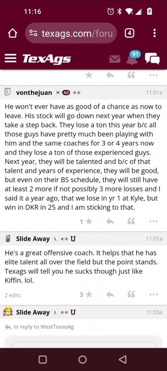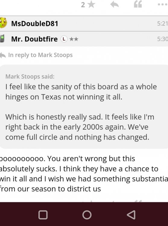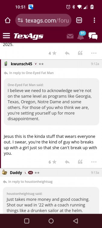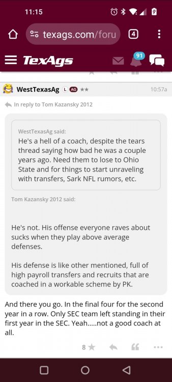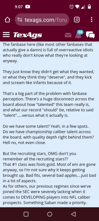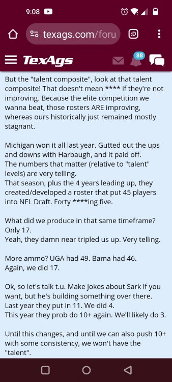 Texas A&M Recruiting 2025: The Land of Melk & No MoneyLonghornfrenzy replied to texifornia's topic in 🤫$9.95🤫 Liucci Segment 1 (00:00:00 - 09:20:19) I am not happy with the way things finished. No one should be. If the people in the building across the street weren't really disappointed by it, then it's the wrong coaches and players. I don't believe that is the case. They were working yesterday because they know it is not good enough. I don't expect anyone to be happy about it. Where I draw my personal line is if you are going to be an ass, then I will take you being an ass and raise you the biggest jerk you have ever seen. I treat people well, but I treat you how you treat me. People in real life are nice. People on a site, whether on TexAgs or any website, become an outlet for this inner jackass. I have no time for those people. It's a very small but very loud percentage. The normal sports fan is pissed about the way the season went. I am, too. It's different covering the team, but for all the people who flew out to South Carolina, Auburn or Vegas or paid top dollar to watch A&M-Texas, it's very disappointing. It's frustrating. If you want to get angry about it, I get it. A lot of people devote a lot of time, resources and energy towards helping the program win. I get all of that. Where I draw my line is when you don't have the right to expect people to not say, "I don't want to hear that." If you don't want to hear anything positive, don't listen to it. If it's not negative enough for you, I don't know what to tell you. The way to go here is to be calm, rational and honest, but see the big picture and be fair about it. For the people who get mad about someone not being angry enough, listen to the words and conversation. If that is not enough for you, then don't listen. We are being more than fair and plenty critical. There are things to be optimistic about. If you want to say you don't want to go there yet and be hopeful... Look, you got some nice wide receivers they are adding from the portal, and they are keeping key players with NIL. They are doing a great job with player retention. They signed a top-10 2025 class. They are doing nice things in the portal, and if they can finish off the defensive line, you feel really good. I wonder if there is room for another linebacker or defensive back. I would find myself another Scooby Williams-type. At times, I saw enough from the offense where you go, "I need to see it to believe it, and I am not going to buy in." I get that. To look at it logically and not expect a noticeable improvement in year one to year two, I think you are letting your anger get in the way. The personnel and the quarterback are plugged into where we are now and what he should be next year. If that is not for you, that's fine, but don't crap on anybody that frankly is trying to look ahead and see where the team should be better. There are plenty of reasons to say this thing should certainly work, and it is fair to say. If you guys don't think I am frustrated, or Nuño isn’t, or people at A&M aren’t, everybody is. It is what it is. There are a lot of college programs sitting in this position right now. A&M is in a unique position in that a lot is poured into this. It's year one of a head coach. There were ups and downs, and the downs were at the end of the season. Segment 2 (09:20:20 - 16:29:10) Everybody wants to be right. People will magically forget when they are wrong and tell you when they are right. 2021 was the early time people were getting on Jimbo Fisher. A year after that was an 8-4 season with a win over Alabama with a backup QB. Who would have known you would continue to have backup QBs with a bad offensive line? You didn't know that after 2021. You guessed right if you were out on Fisher after 2021. You probably guessed a lot of things wrong, too. I am wrong, too. But I am right a lot, and angry fans will never point that out. All of this is fine if you are not a jackass. If you run a Twitter account and are A&M-related and want to take a shot at us, I will not engage with that. I am not giving you a platform. If you are a site I don't respect, and most of them I do, but there are a couple that like to take shots at us. The door is right there. We don't do that on social media. We can have a conversation. It’s a failed effort if you try and bait me. Segment 3 (16:29:11 - 31:03:27) In Dan Campbell's first year with the Lions, they were 3-13. It doesn't happen overnight for a lot of people. Both things can be true. In its totality in year one, for any first-year coach, you can go down the list of things they did accomplish. All of you know it, and you choose to acknowledge it, or you don't. There is a reality of how you finished, and it should be. It dulls the enthusiasm. I am not just a fan, but I am a fan. I am a fan of the Astros. Some of you would love a show where we went crazy. It would get tiresome. The fans that want to crap on everything forever, it gets tiresome. Fans that want to be pissed watching A&M lose its fourth Power 4 game in a row, I get it. Everybody is mad. I get the anger, frustration and disappointment. I am not going to tell anyone that they shouldn't feel that way. The overwhelming majority appreciates our words and the show. I don't care if you don't like it. 8-5 in year one is not bad. Not good, but not bad. Better than a lot of teams historically around this league. People don't want to hear that now, but you know it's true. You were 8-5, but two of the wins were against top-10 teams. "But it was Missouri and LSU." That's not how we do it. 8-5 with four wins over teams with winning records. In the last three years combined, A&M won four games against SEC teams with winning records. This year, A&M beat Missouri, LSU, Florida and Arkansas. This is not a parade thing. The point is that there was an improvement in this program. The problem is the end of the season didn't make it feel like it. The reality is they lost two 