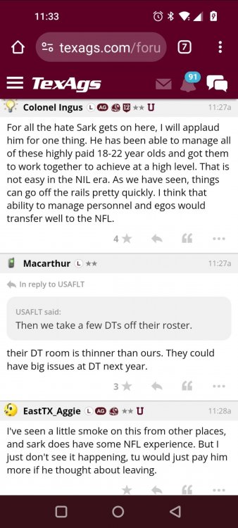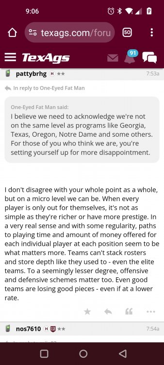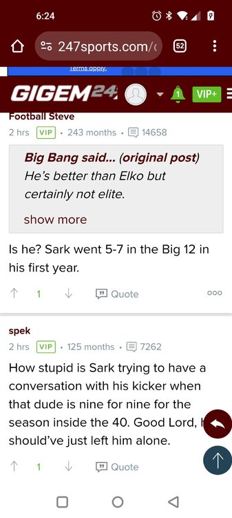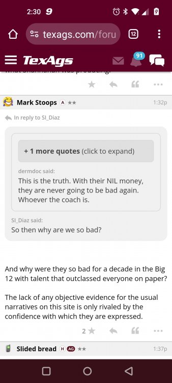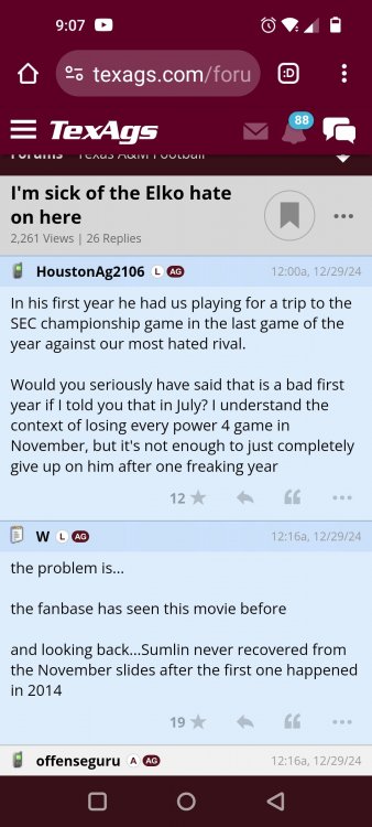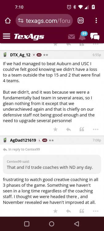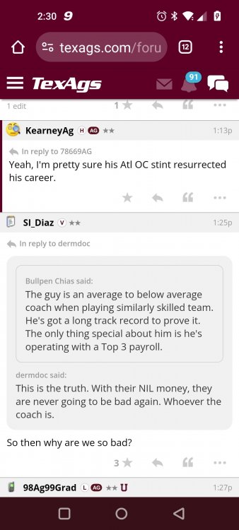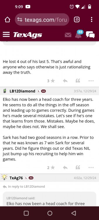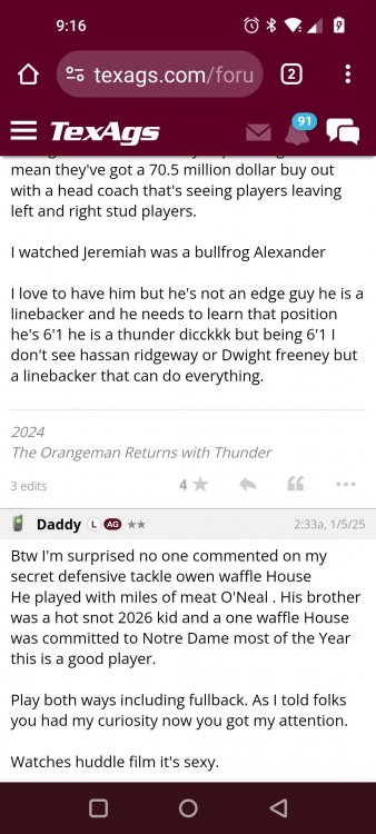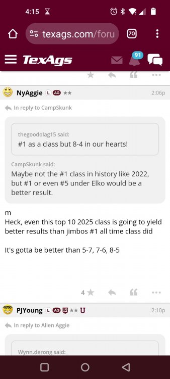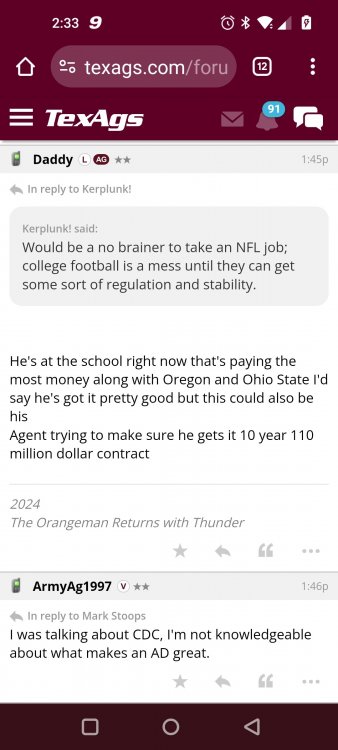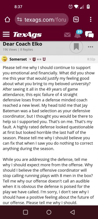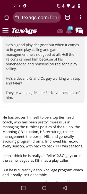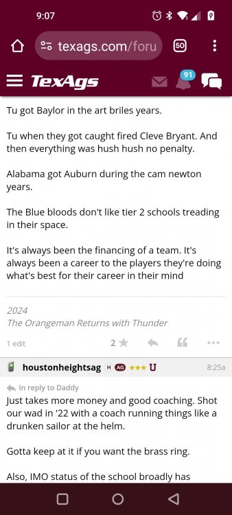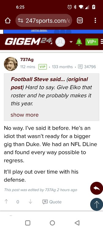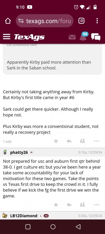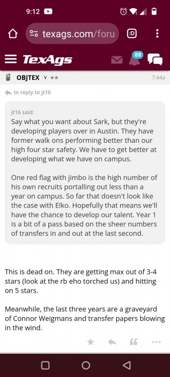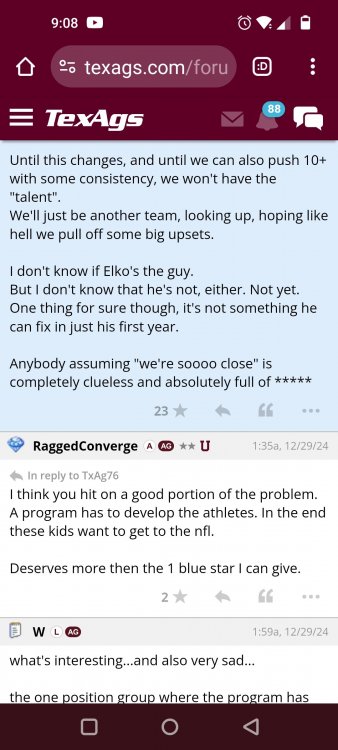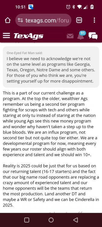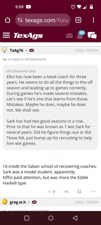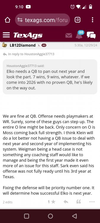 Texas A&M Recruiting 2025: The Land of Melk & No MoneyLonghornfrenzy replied to texifornia's topic in 🤫$9.95🤫 Liucci 12/29/24 Okay if this wasn't the travel day from hell. As if USC's last second, come-from-way-behind win wasn't enough, how about two hours on the runway in Vegas plus another hour waiting for a gate at IAH followed by a 45-minute wait at baggage claim then a nice drive to College Station in the fog. On second thought, maybe that fog was just me dealing with the lingering effects of the game. Either way, had some time to answer questions and will hit a lot more tomorrow in addition to some kind of video content. Enjoy. And forgive me for any typos, as this was written on the plane and with a faulty 'r' button on my keyboard! Just wanted to post it tonight as a normal thread rather than wait until the content crew could get it up tomorrow. Do you expect any changes to the coaching staff? Two things at work here. First one is that head coaches typically shy away from making changes following year one. That's especially true when the assistants essentially inherit their room. Times and circumstances are different now, however. We're in the portal era and the Aggies just dropped their last four games against Power 5 opposition and, for different reasons, each loss revealed real issues. Elko is not the type (at all) to sit back and accept what we saw down the stretch this fall so he's not likely to be bound by the "well this was year one and we're a new staff looking to turn things over" mantra others I've covered have been. Haven't heard of any specifics but I have been doing this a long time. I'd expect at least a slight degree of attrition whether it would a change from within or someone finding an opportunity elsewhere thus freeing up a spot. We'll know soon enough but I'm confident Elko will take a very honest look at how his staff performed in 2024 and have an uncomfortable conversation if he has to. And that's true for at any point during his tenure here. What are your general thoughts and feelings right now both short and long term? Long term I believe the guy coaching at Texas A&M is going to figure it out. I actually would like to sit down with him at TA more often this off-season so folks could learn a little more about the way he's running and building the program, day to day and big picture. It's part of why I'm confident he's the dude to get this thing going how it needs (and deserves) to be. But he has to get there, and doing so requires winning in the short-term. The Ags were doing that at a very impressive clip following Notre Dame but fell hard in November. So we're all adults here and understand that a lot of potential 'in the moment' momentum was lost by not winning a game or two more (winnable ones, at that) and shocking the country by appearing in Atlanta. I even think last night was a chance to score tangible momentum entering the off-season and the Ags didn't do that (in pretty embarrassing and discouraging fashion, no less). My short-term concern is this coming season because time waits for no coach or program in the SEC and the Ags are in need of a strong close to the portal season because there are real holes to fill (beyond just one more playmaking receiver and shoring up the d-line in a big way) and the schedule is much more unforgiving in 2025. Elko and Co. need to attack this second half of the early portal window in a big way. Coaching changes? Thanks I'll hang up and listen. See above. Feel like I'll be saying that a lot here. What are the odds Bateman gets fired? No idea on odds of such things but the head coach and DC clearly have a lot to figure out when you look at how the Ags played on that side of the ball for halves and/or full games all too often this season. And, injuries aside, the head-scratcher for me is the fact that Elko openly stated this off-season on more than one occasion how excited he was about this year's defense even compared to past A&M units he's coached. Definitely something the head man has to be very disappointed in when he looks back on this past season. Outlook for next season? See above. Concerned but also far from deflated or panicking. There really should be a noticeable year one to year two jump for a program under a new regime and also for a ton of individuals who will play key roles next fall. However, help also needs to arrive and if I'm Elko right now, I'm taking a hard look at every position. I know the Ags were without a lot of key figures on defense last night (three starting DL, two corners including your best and your best linebacker) but you also had guys you're planning to depend on next year on both sides playing who struggled mightily to make winning plays. Why do you think the team collapsed after the LSU win? Tough one to answer. I think first and foremost, they took a couple of big hits at South Carolina, not the least of which was their confidence and I believe they weren't the same team physically after that night. Losing Le'Veon Moss proved to a real killer and the Ags had also lost Bisontis a week prior. The interior ground game took such a big hit there and that was so important in terms of sustaining drives and even down near the goal line but also helping Marcel Reed along in his development as a passer. I'm just talking about keeping him out of bad situations. Scooby Williams missing time and being hut was also a big deal because he's the most active dude in that font seven and was beginning to look like a difference-maker. However, I also think it's fair to say that the book was out on the Ags by the time November rolled around. Make Reed and the A&M passing game beat you down the field, sit on early-down runs and run right at the Aggie defense. South Carolina, Auburn and Texas did so with alarming degrees of success. The fact that Elko volunteered last night what was pretty obvious down the stretch was telling, as well. The inability to have the confidence to run very much zone is 