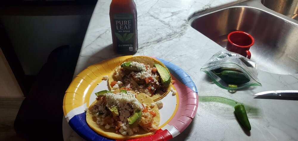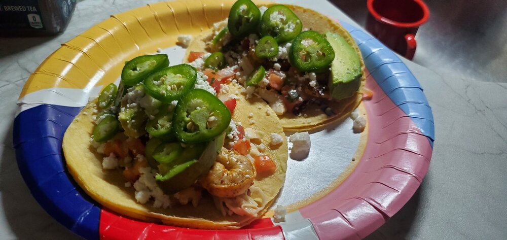 1. Campsite cooking. Wind was so bad, had to wrap foil around the griddle to get the temperature up. Simple shrimp taco with slaw, chipotle ranch, cado, queso fresco, Jalapeños, and serranos from the garden.
