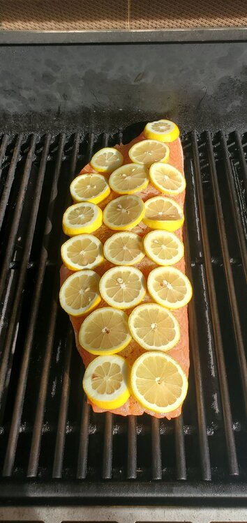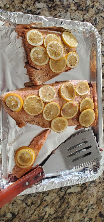 10. Yes the lemons give a more uniform texture throughout. I prefer a slightly gelatinous fish as weird as that sounds. It looked done so I temp probed it and was 125 deg. Perfect. The lemons normally go in the garbage disposal. Fish also had a coating of butter and a dusting of lemon pepper. Turned out great.